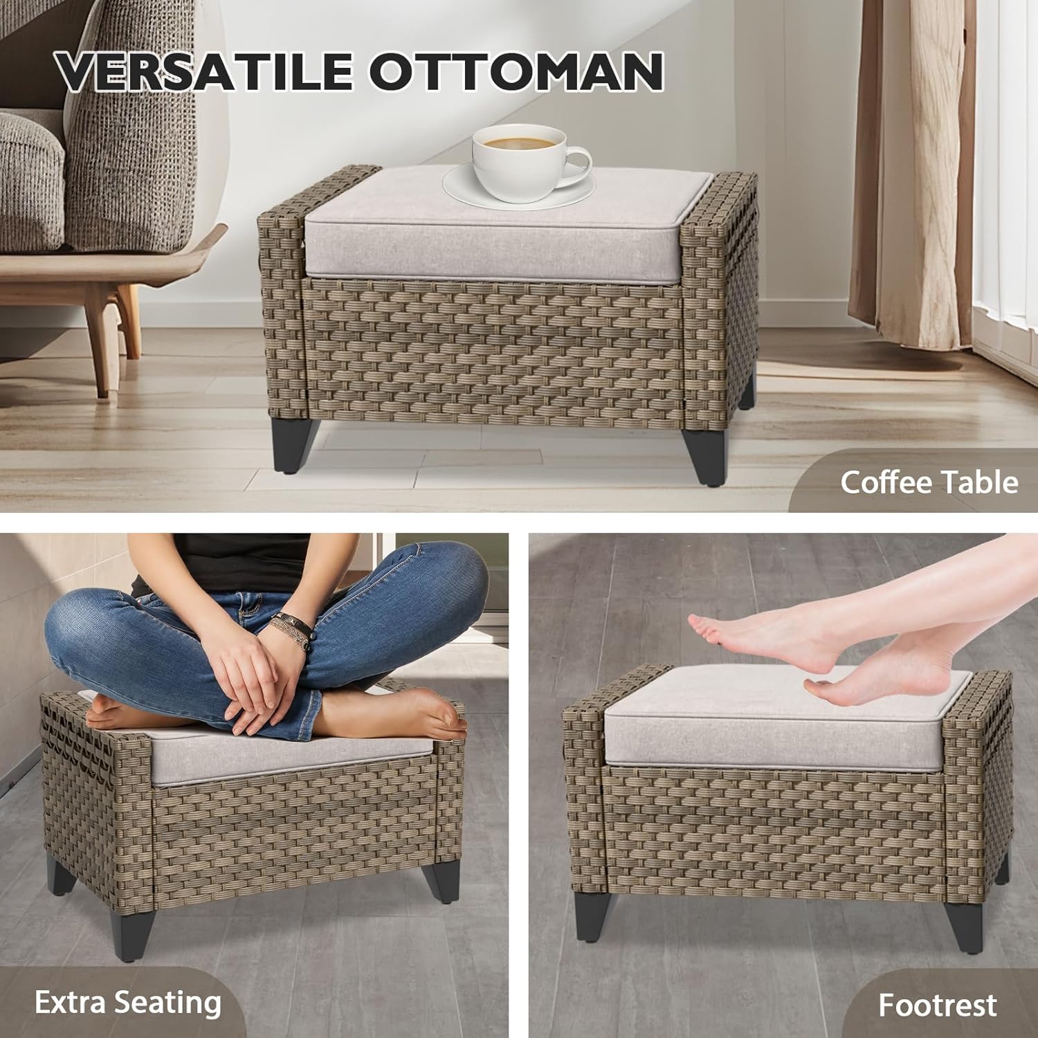 - STYLISH WICKER: This 4 piece rattan furniture set, includes 2 sturdy armrest chairs and matching ottomans, that provide support for you neck, back arms and legs. Tramsform your garden, balcony, deck, patio, porch, sunroom, yard or poolside oasis with this outdoor furniture set.