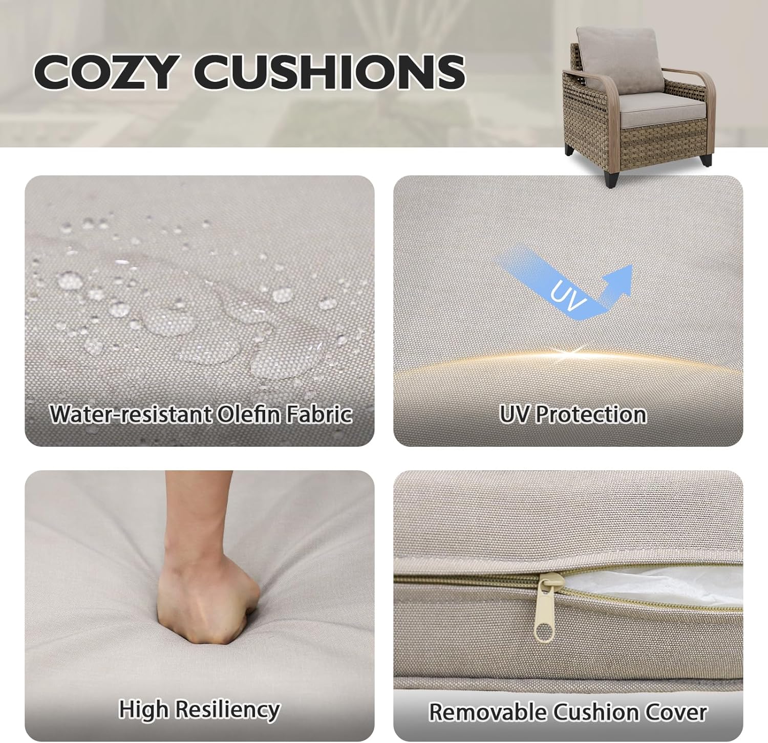 - GATHER, RELAX, ENJOY: These wicker armchairs have generously widened seats and plush 5-inch back cushions for ultimate comfort. Designed for outdoor living, it's made with UV protection and weather resistance materials, making this furniture set the ideal choice for stylish, worry-free lounging.