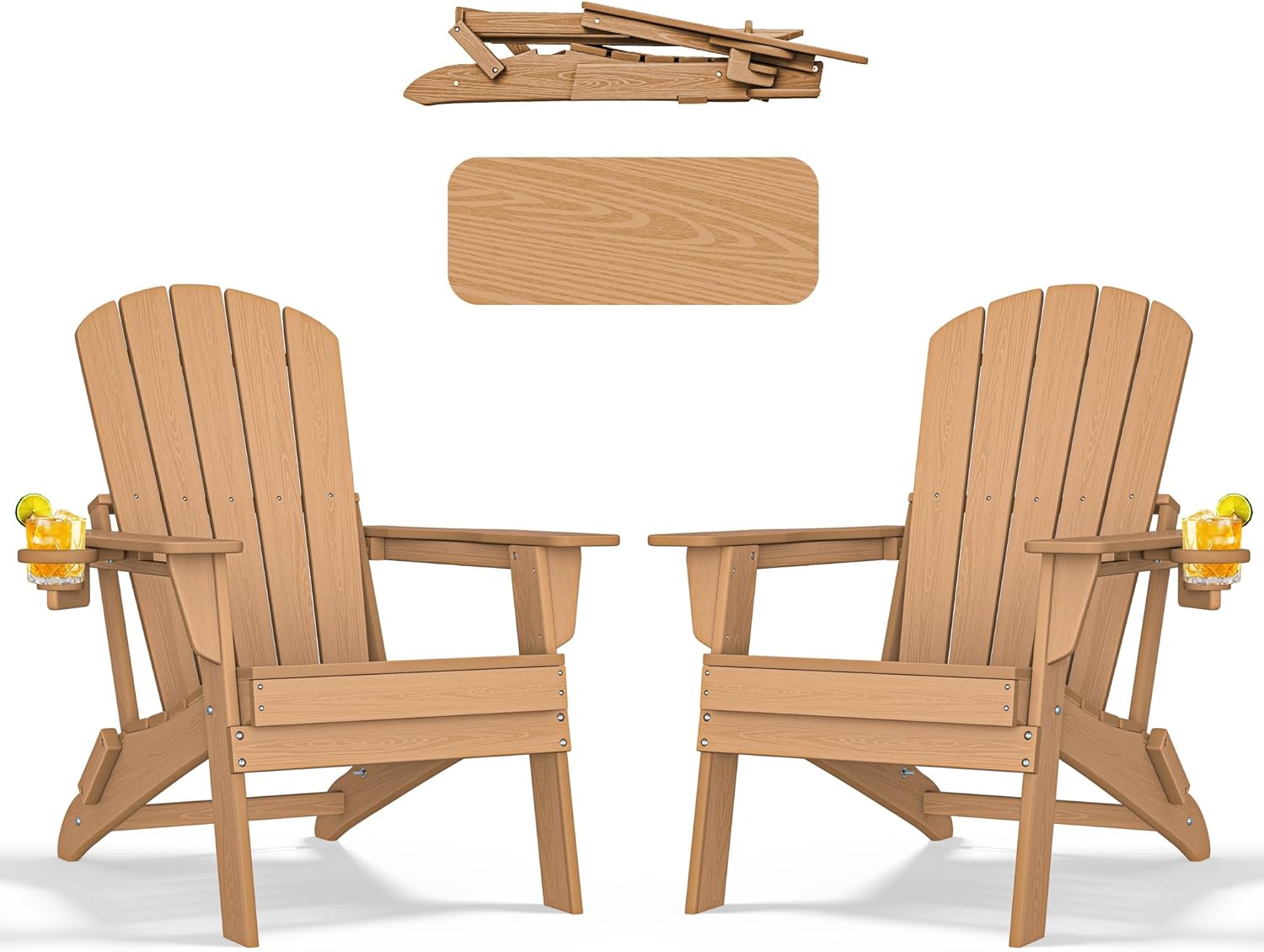 Folding Adirondack Chair - Extended Ergonomic Backrest, Cup Holder - Easy Assembly - Durable HDPE Plastic, Weather Resistant & Maintenance-Free - Lawn, Patio, Deck Supports 380lbs Teak