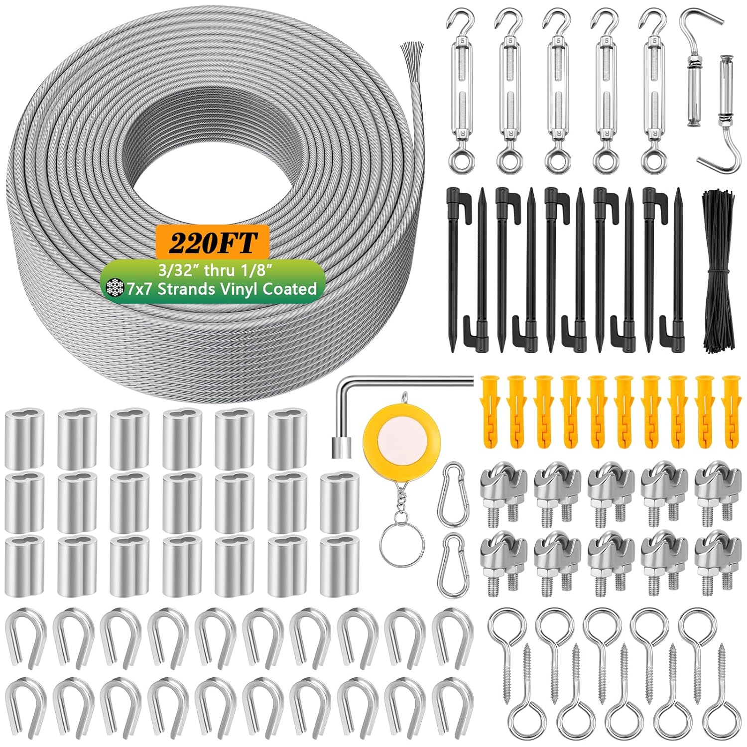 220 FT 1/8" Wire Rope Kit, 304 Stainless Steel Cable with M5 Turnbuckles for Cables Wire, Vinyl Coated String Lights Hanging Wires for Outdoor Camping, Trellis, Garden, Clothes line, Curtain, Festival
