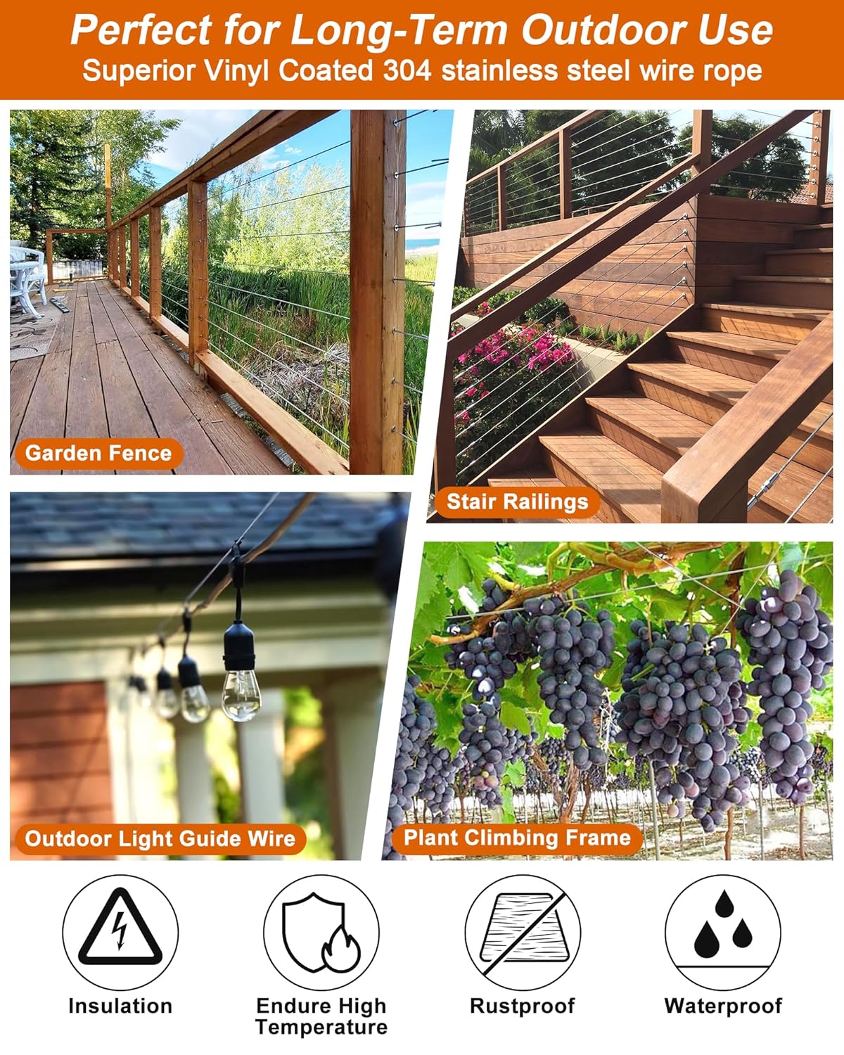 - [Effortless Installation] Say goodbye to complicated setups! Our vinyl coated stainless steel cables are a breeze to install. Simply cut the desired length using cable cutters, secure the buckle head with M3 thimbles and aluminum sleeves, and utilize the included tools for various scenarios