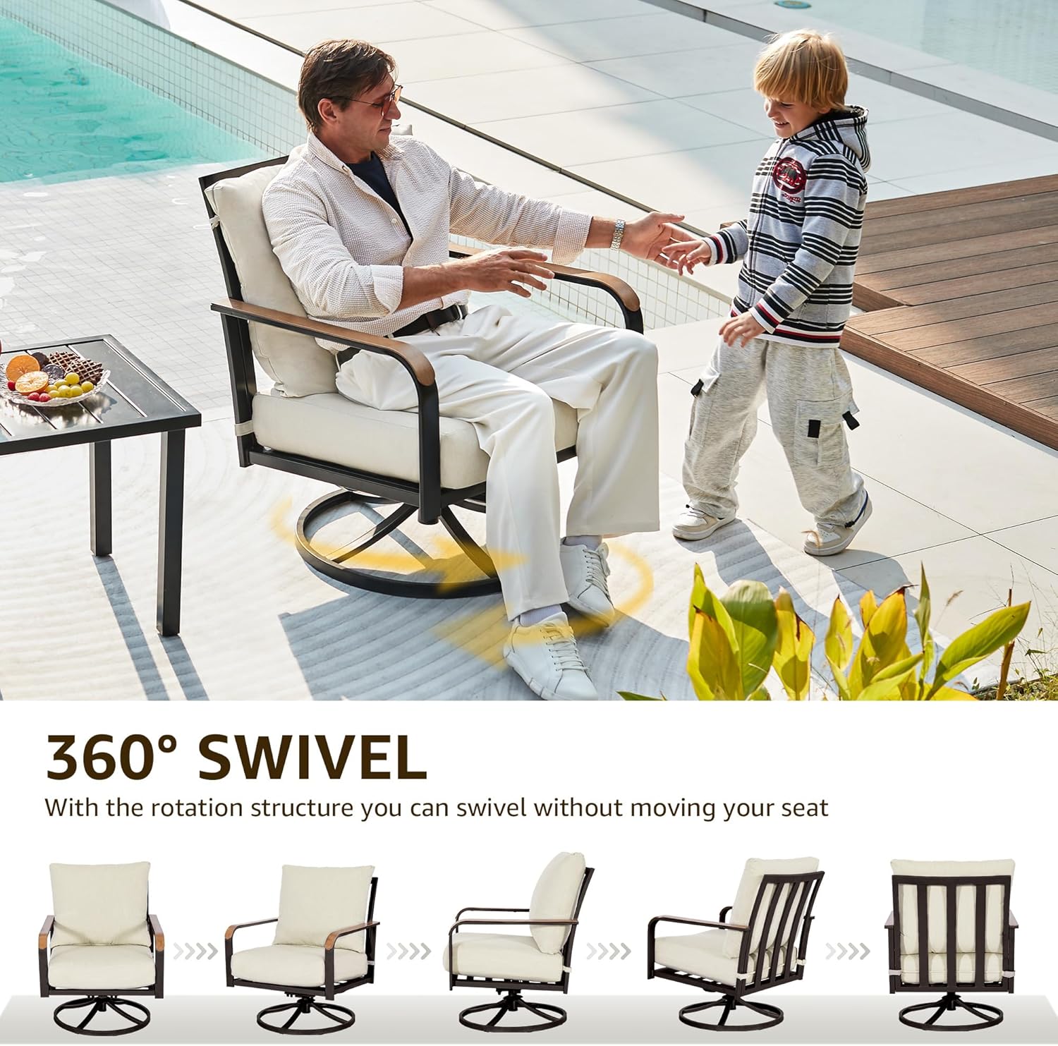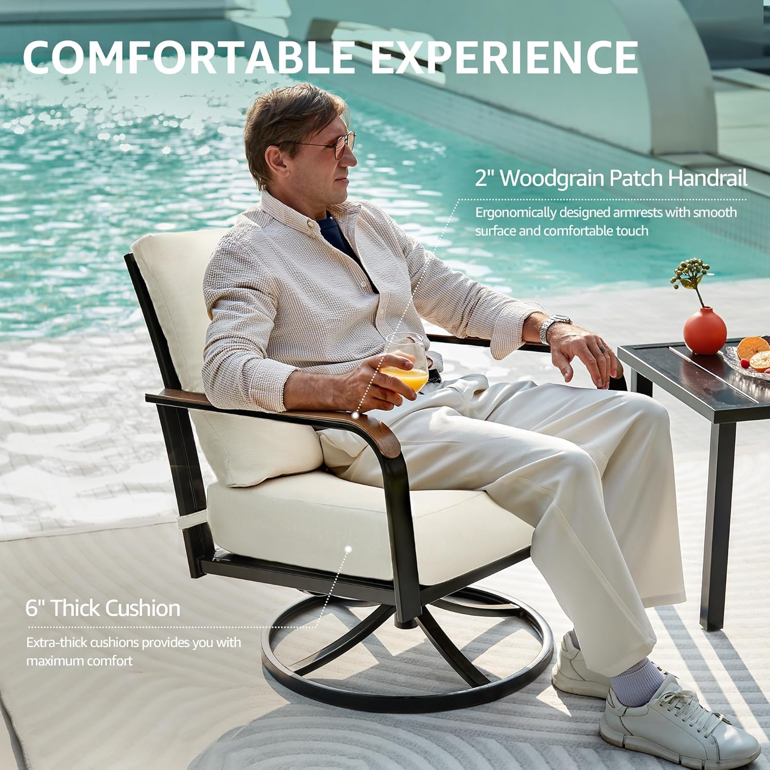 - 【Rust Resistant Frame & Wood Grain Armrest】This outdoor swivel rocker chair is made of powder coating metal frame,which is rust resistant and heavy duty, support up to 350lbs .The wood grain armrests add a sense of decoration, and the ergonomics high back can give your more comfort.