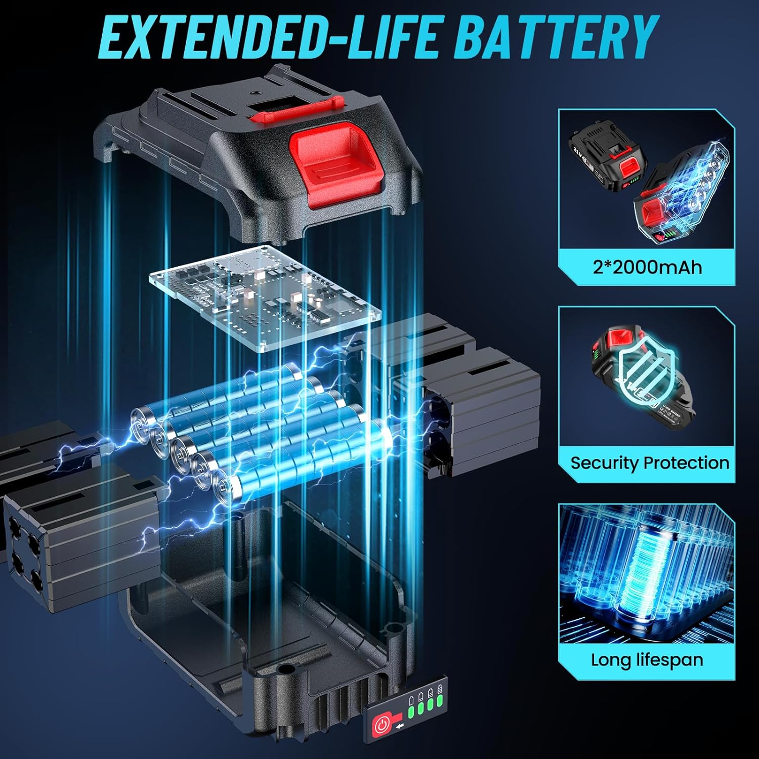 - Extended Battery Life: Say goodbye to interruptions with our dual 2.0Ah batteries, designed for extended use and long-lasting performance. With built-in overload and temperature protection, these batteries provide consistent power, minimizing downtime and enhancing your productivity