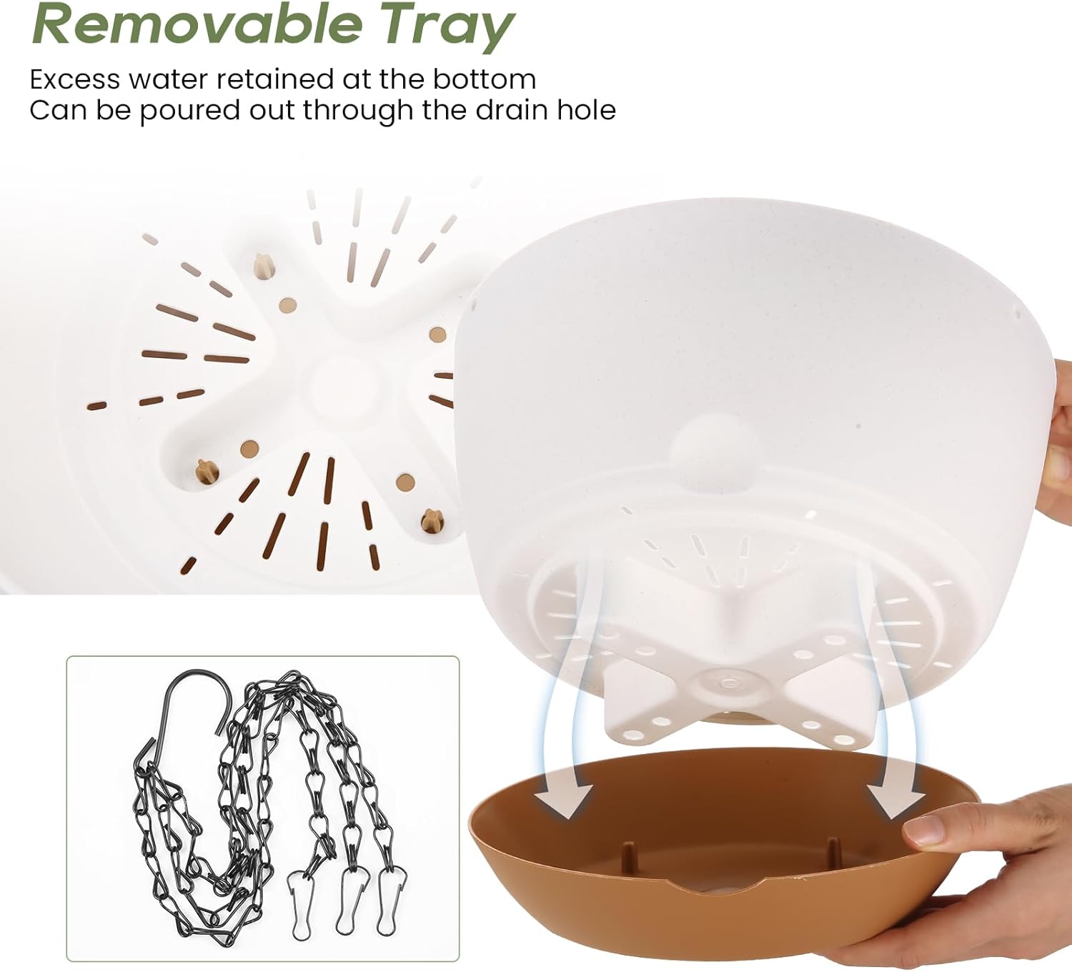 - Automatic Drainage Design: The hanging planter has drainage holes at the bottom, When the water exceeds the edge of the tray, it will overflow from the edge, so that your flower pots will not drown or over water in rainy days.