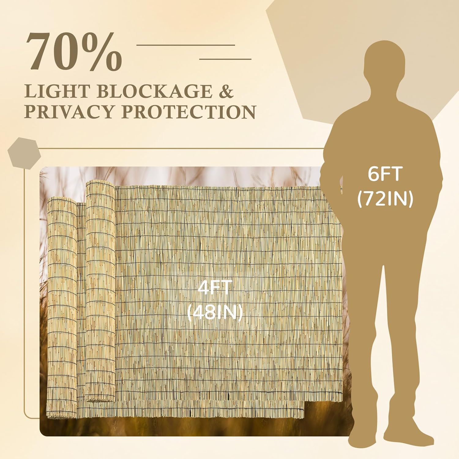 - Material and Craftsmanship: Each reed screen is meticulously hand-selected, and the garden reed fencing is woven together with cotton strings. The bamboo reed fencing can block 70% of the sun's heat, providing more shade and keeping the area cool throughout the summer