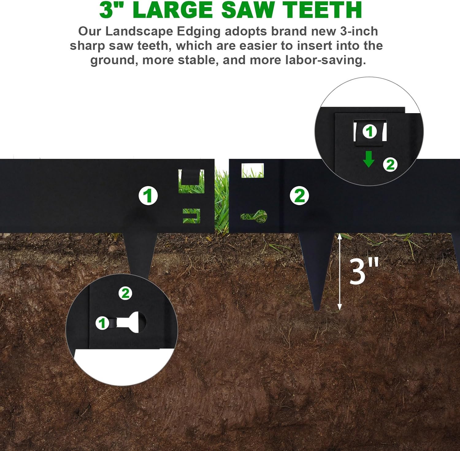 - [3" Large Saw Teeth] - Our Steel Landscape Edging adopts brand new 3-inch sharp saw teeth, the no-dig design, along with the included clips, which are easier to insert into the ground. The 7 inch depth is perfect for keeping mulch and soil in place while preventing grass from encroaching into your flower beds
