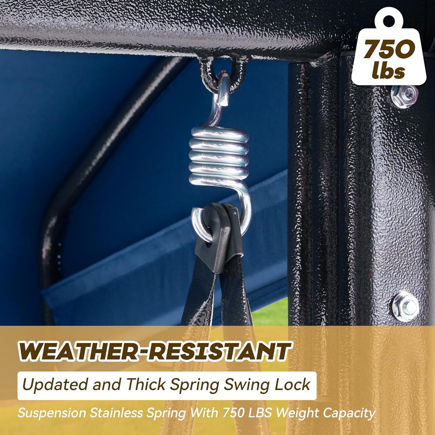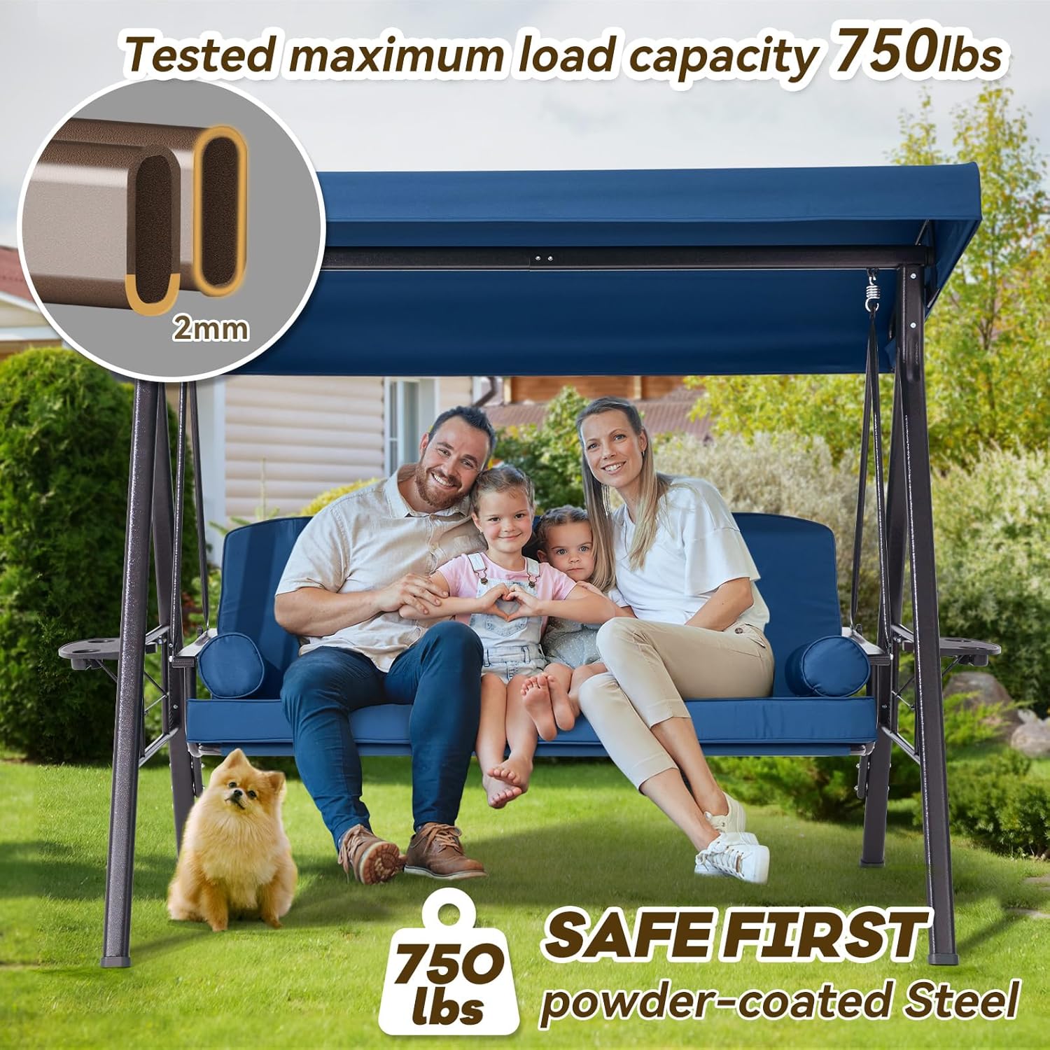 - ăSturdy and Safe Constructionă: The maximum weight capacity of porch swing is 750 pounds, our glider swing is designed for 3 adults to sit comfortably. The swing outdoor has a reliable buckle on backrest, ensuring stability and preventing any unwanted swinging. The double protection of 3 seat garden swing is designed for preventing accidental tipping.