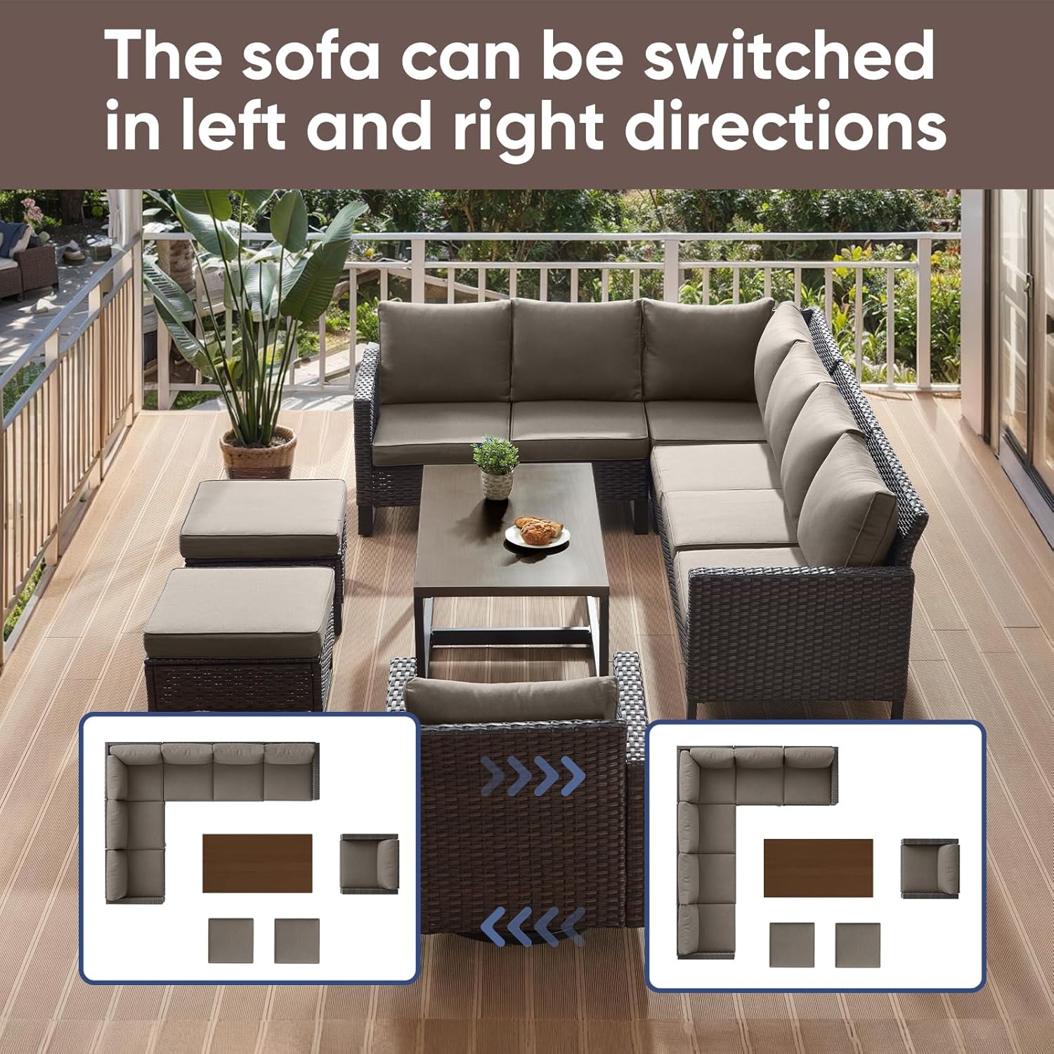 HUMMUH 10 Piece Patio Furniture Set PE Wicker 3 Outdoor Sectional Sofa Set with Patio Chairs Dinning Table Ottomans for Porch,Garden,Backyard,Deck(Brown/Grey)
