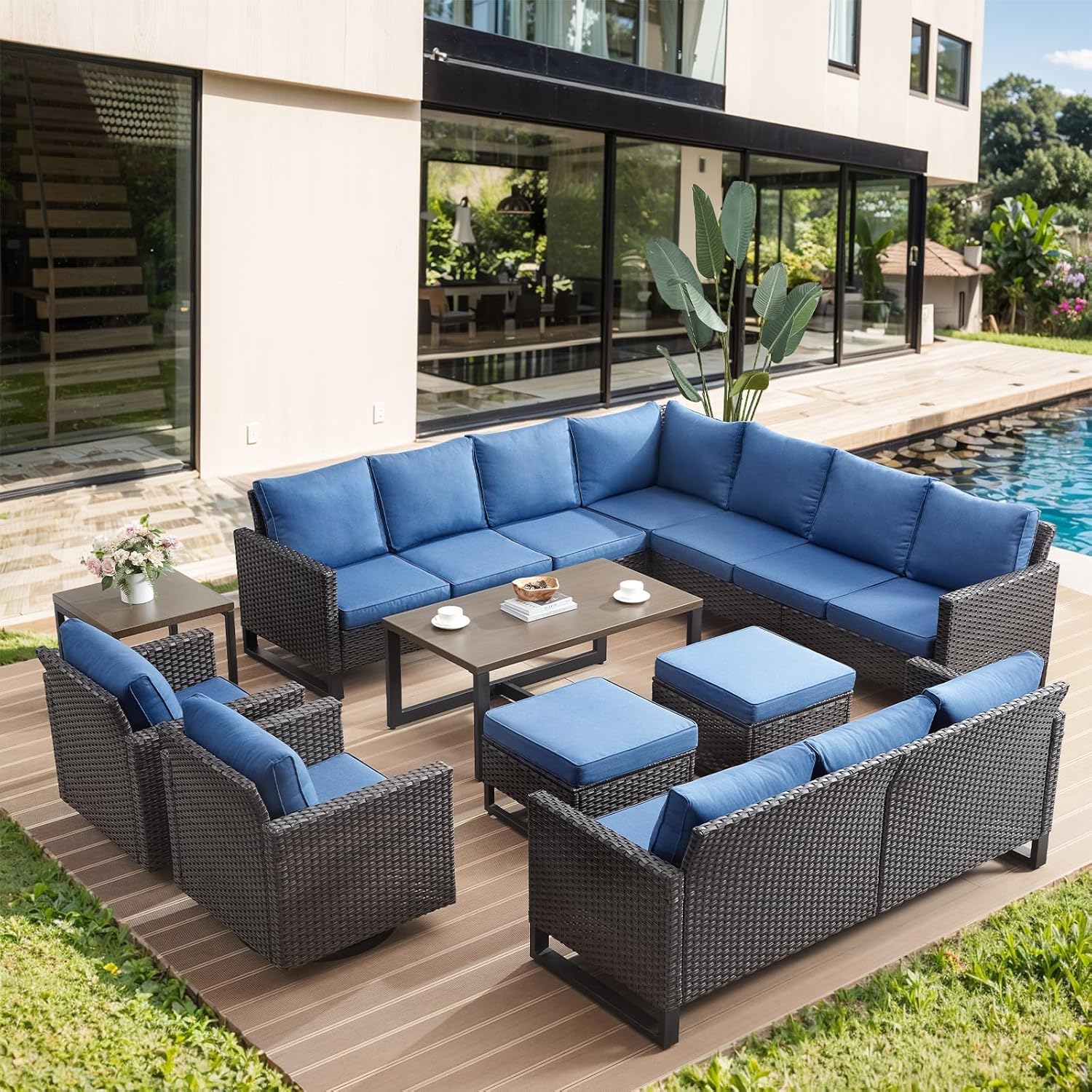 HUMMUH 10 Piece Patio Furniture Set PE Wicker 12-Seater Outdoor Sectional Sofa Set with Patio Swivel Chairs Dinning Table Ottomans for Porch,Garden,Backyard,Deck(Brown/Blue)