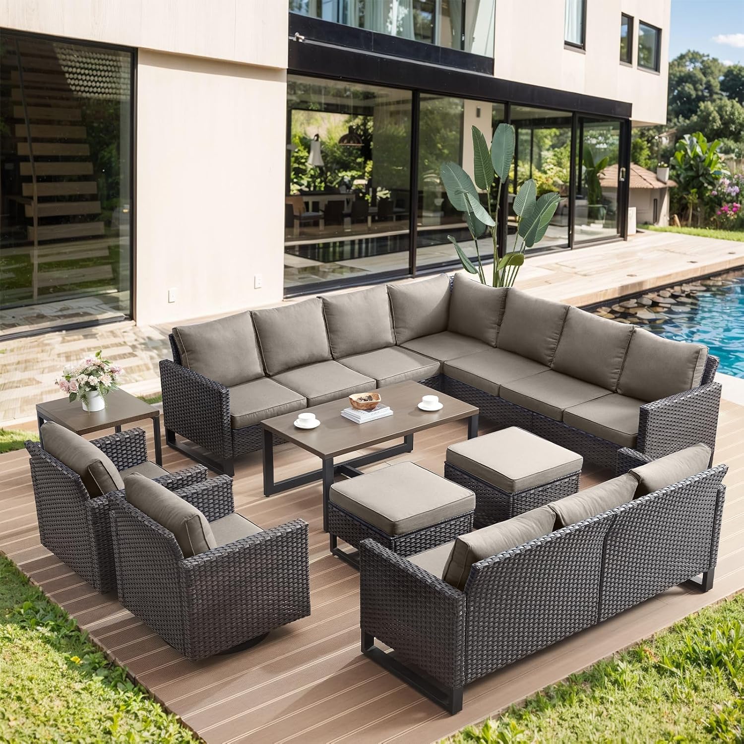 HUMMUH 10 Piece Patio Furniture Set PE Wicker 12-Seater Outdoor Sectional Sofa Set with Patio Swivel Chairs Dinning Table Ottomans for Porch,Garden,Backyard,Deck(Brown/Grey)