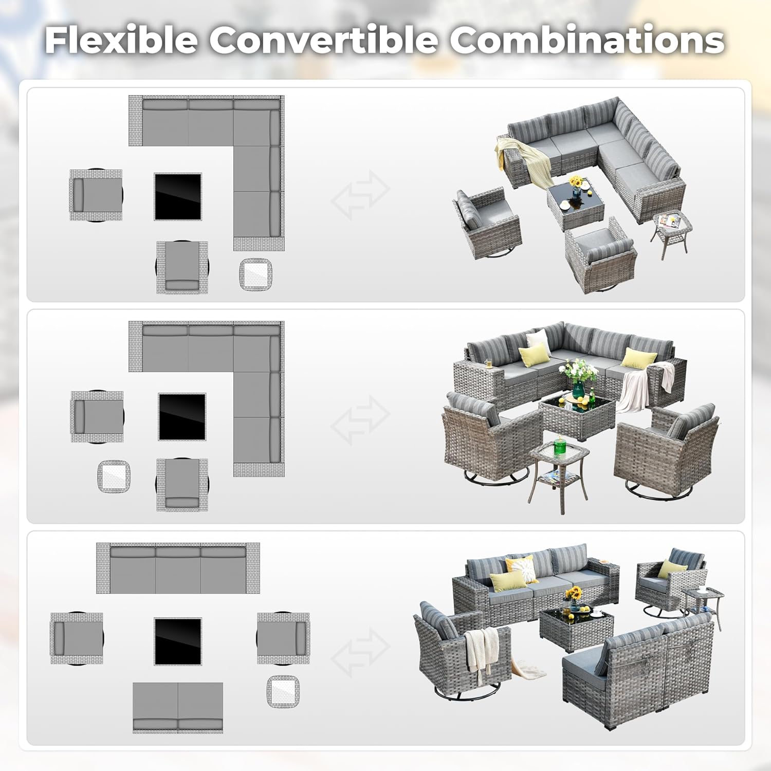 ovios 9 Pieces Patio Furniture Set, Outdoor Wicker Sectional Sofa with 2 Swivel Chairs Coffee Table, Modern Modular Deep Seat Rattan Couch Conversation Sets, Dark Gray Stripe