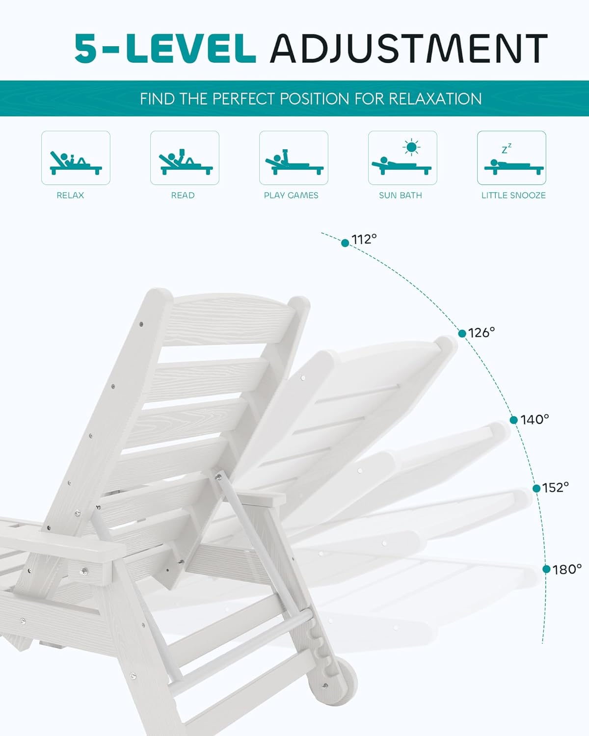 - Modern Stylish: Our HDPE adjustable patio lounge chair with wheels is available in a variety of colors, allowing you to choose one that complements your outdoor decor. Its modern design adds both comfort and practicality to any outdoor space.