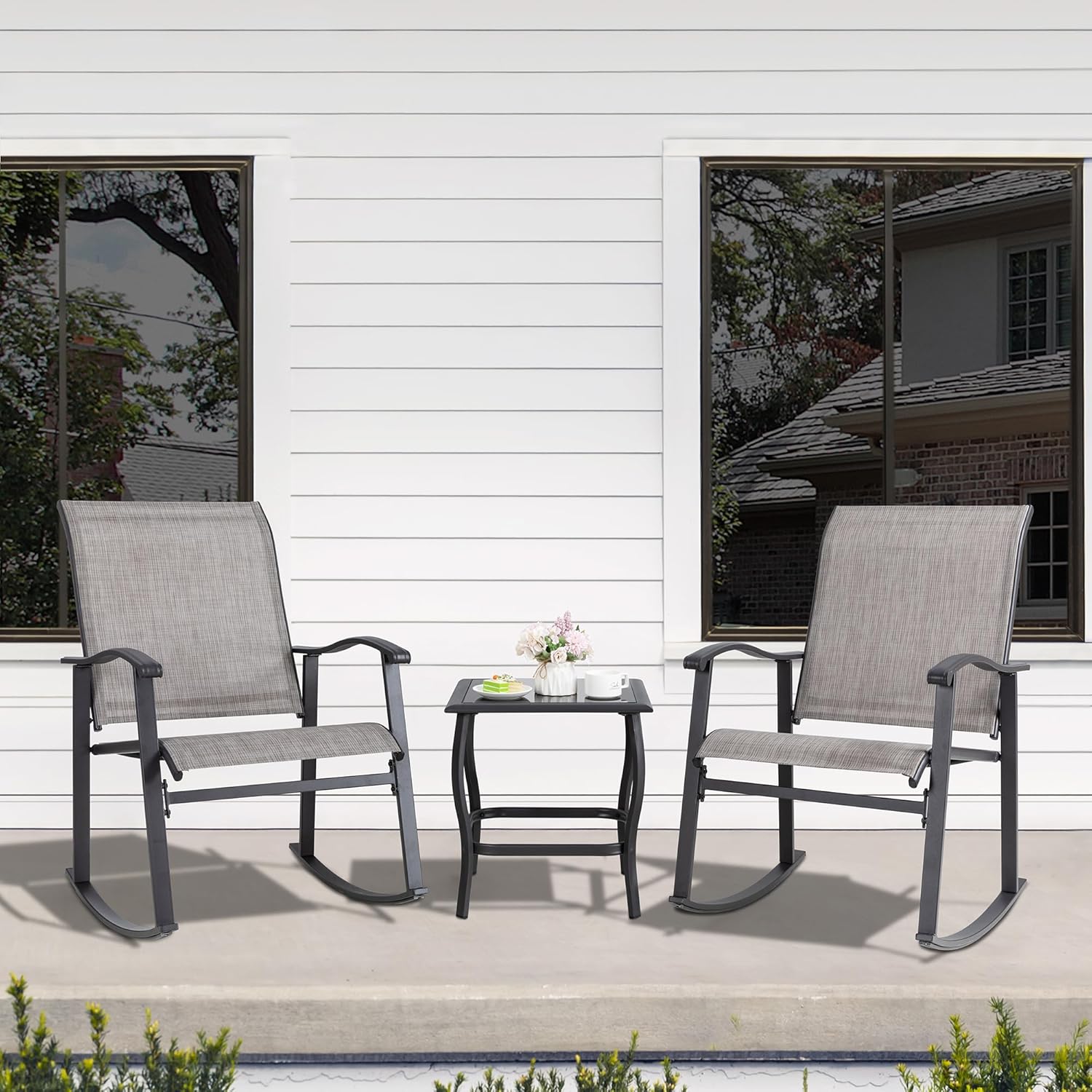 - Wide application: This small patio furniture set includes one bistro coffee table and 2 rocking chairs. The simple looking and solid color making it suitable for yard, poolside, lawn, balcony, garden and front porch.