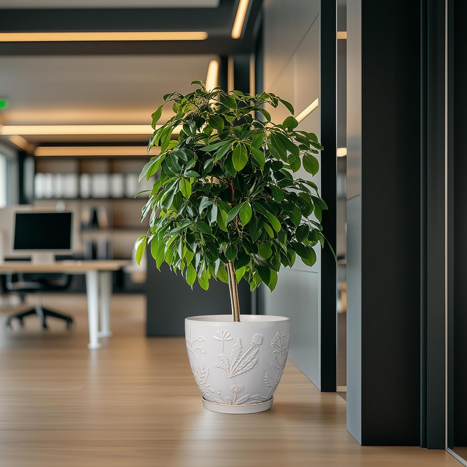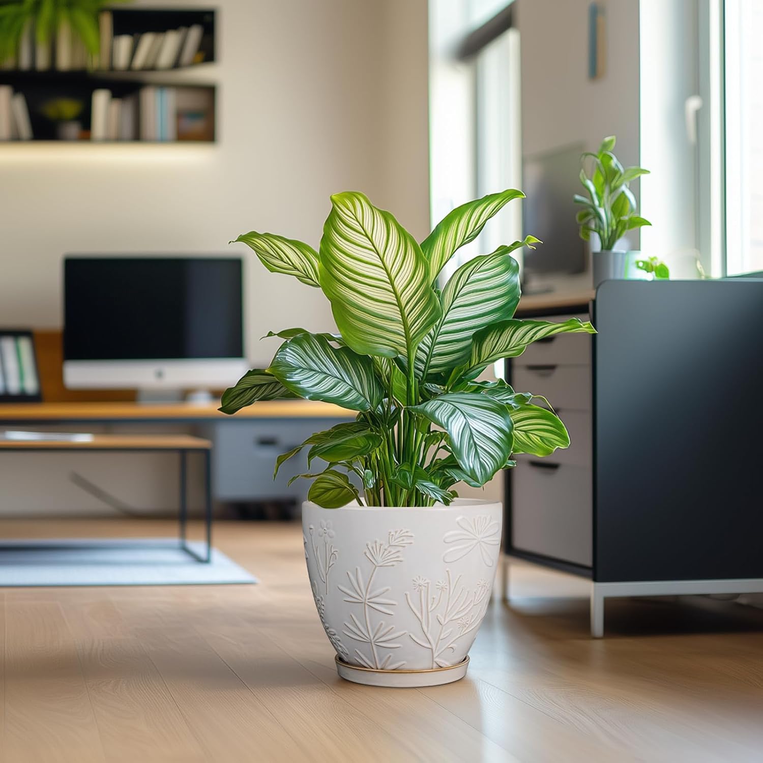 - Stylish Appearance: Our ceramic planter pot has a white main colour, a beautiful embossed flowers and plants pattern on the surface, elegant appearance making it ideal for home decor, garden decor and office decor