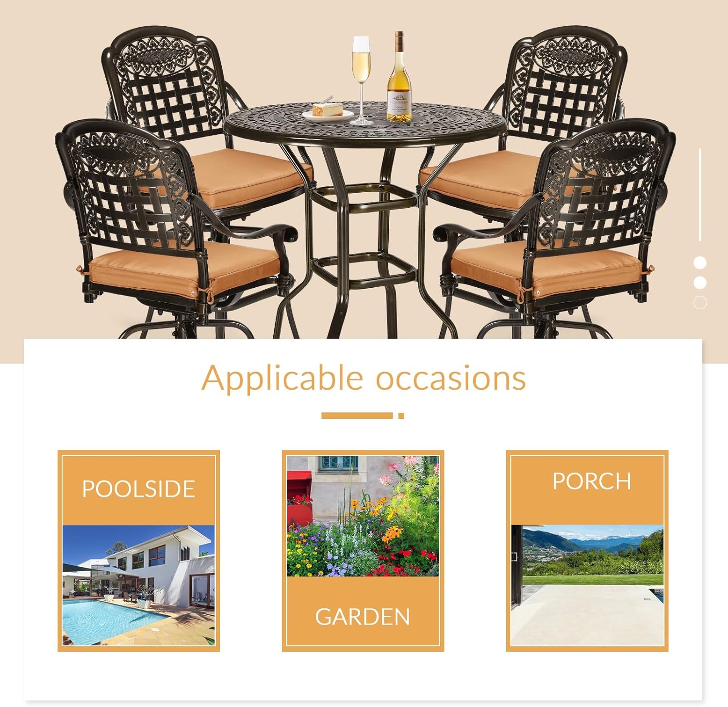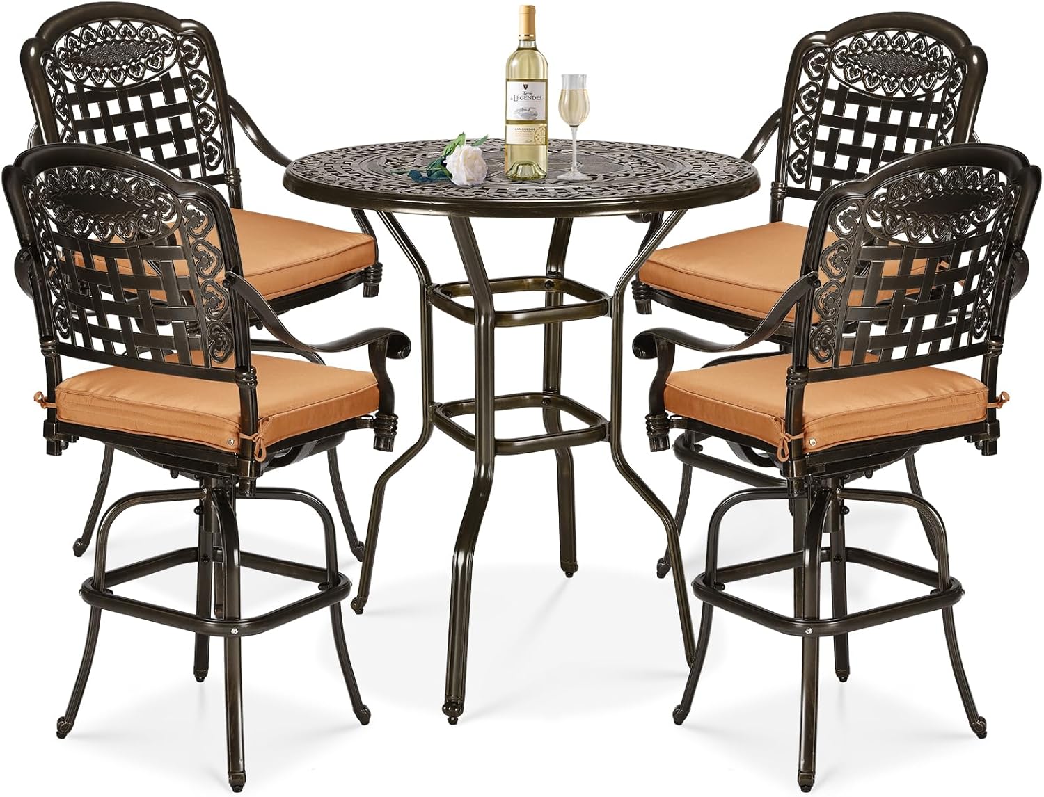- 【5-Piece Patio Swivel Bar Set】This swivel bar stools set includes 1 bar bistro table and 4 swivel bar stools. The classic and elegant design makes the patio bar set a perfect addition for your relaxing space. You can use this high bar stool set for dining, entertaining or conversation in both indoor and outdoor occasions. Due to the lightness of the material, it is convenient for you to move it to any outdoor occasion you like, suitable for restaurants, cafes, hotels and all commercial settings.
