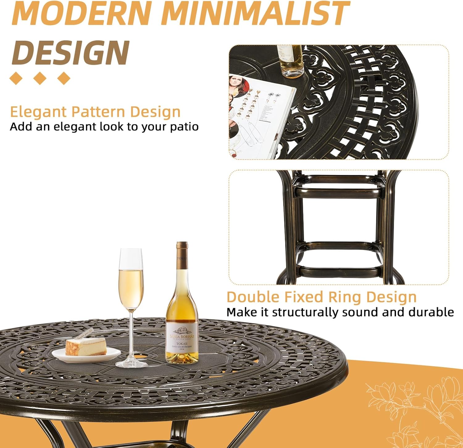- 【Premium Materials】The outdoor swivel bar stools set is made from cast aluminum for long-term durability. Resistant to rust, weather, fade, crack. The patio furniture set features an oil-rubbed bronze finish for a timeless look that is designed to withstand the elements year-round. If you use this set by the pool, it’s all-weather quality helps prevent water damage caused by wet swimsuits and splashing. It is also easy to clean, you just need to use a cloth to easily wipe away the dirty things.