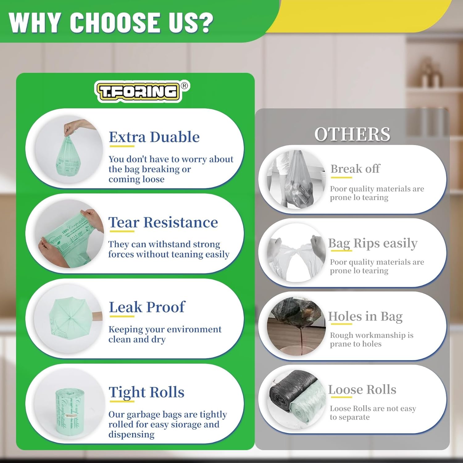- ăEco-friendly for EnvironmentăT.FORING compostable bags are made from corn starch and plant-based materials,no polyethylene.Bags are durable, nontoxic, easy to use and great for the environment.T.FORING 4 gallon trash bags decomposes fully into CO2, water and organic biomass after 6-12 months, leaving no traces of plastic in the environment.
