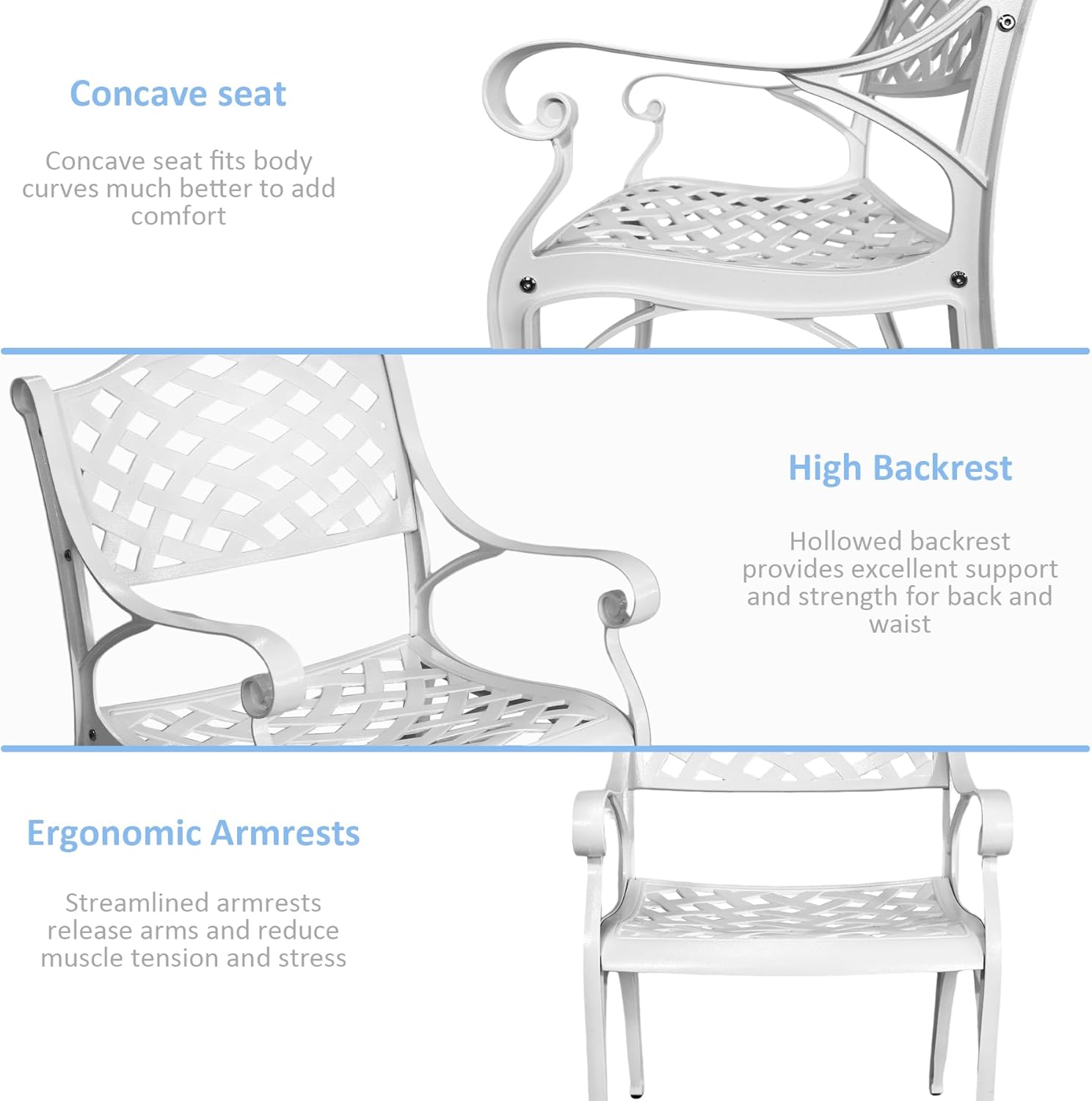- Comfort Backrest & Ergonomic Armrest: Ergonomically designed backrest and seat of the outdoor bistro sets add more comfort to your body and can effectively relieve fatigue. The curved armrests on patio seating are of moderate height, provide support for hands when resting.