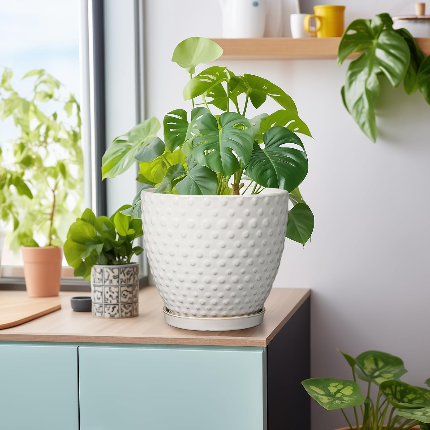 - Draining Hole and Tray: The ceramic pot for plants has a drainage hole at the bottom which prevents root rot. It also comes with a ceramic tray to catch excess water and keep your table and floor tidy