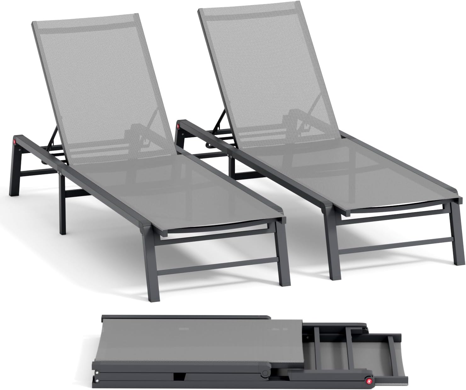 Aluminum Chaise Lounge Chair Outdoor, Foldable Patio Lounge Chair 2 Sets Assemble-Free, Pool Lounge Chairs with 5 Adjustable Backrest, Outdoor Lounge Chairs for Outside Poolside Beach Lawn Grey