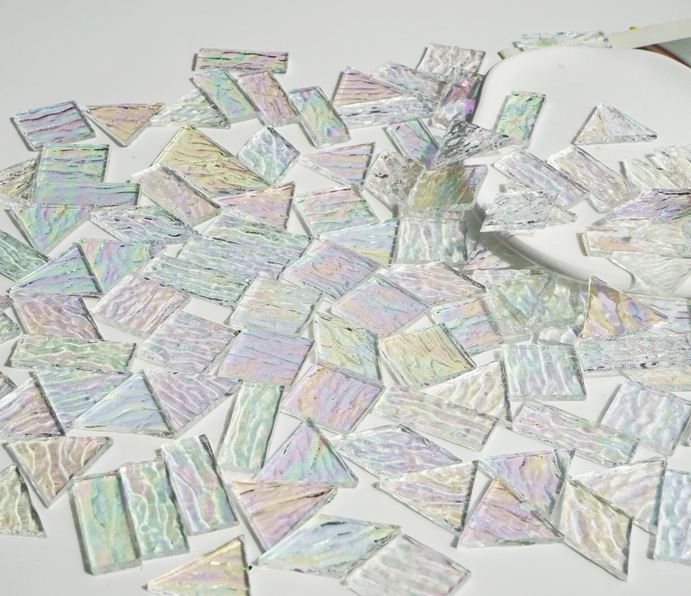 Iridescent Textured Cathedral Glass Mosaic Tiles, 200g Transparent Stained Glass Pieces for Mosaic Art, Pre-Cut for Handmade Crafts, Clear