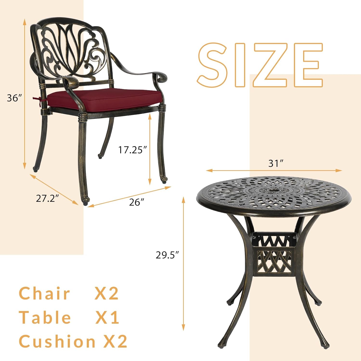 3-Piece Outdoor Patio Dining Set, All-Weather Cast Aluminum Patio Furniture Set for Backyard Garden Deck with 2 Cushioned Chairs and 31” Round Table, 2" Umbrella Hole, Chili Red