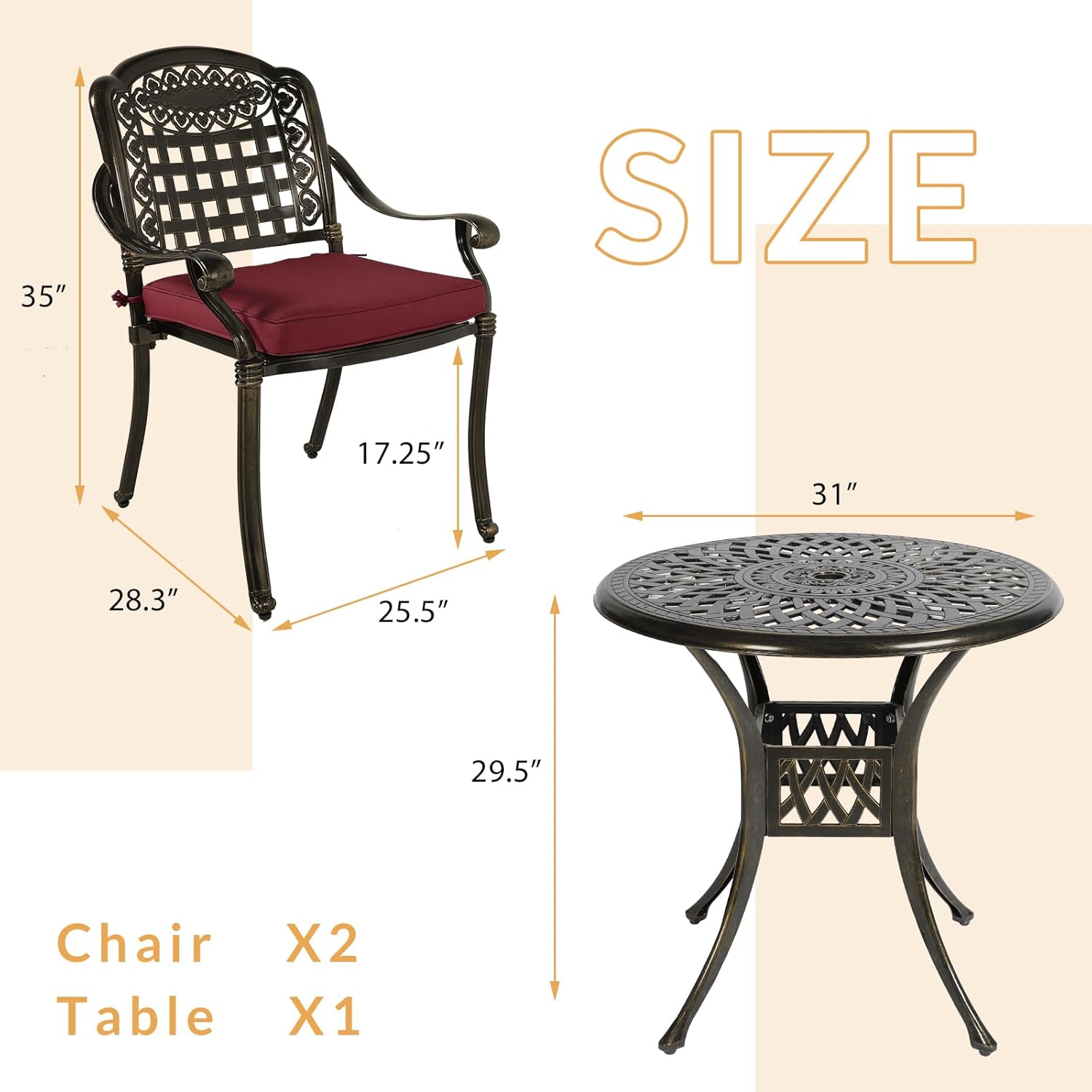 - 【Durable 3-Piece Dining Set】 - Made from cast aluminum for long-term durability. Resistant to rust, weather, fade, crack. This patio set includes 1 round table, 2 chairs, 2 cushions, and they stay in perfect condition regardless of the weather. It's also easier than ever to clean, just use a dry or damp rag to wipe down.