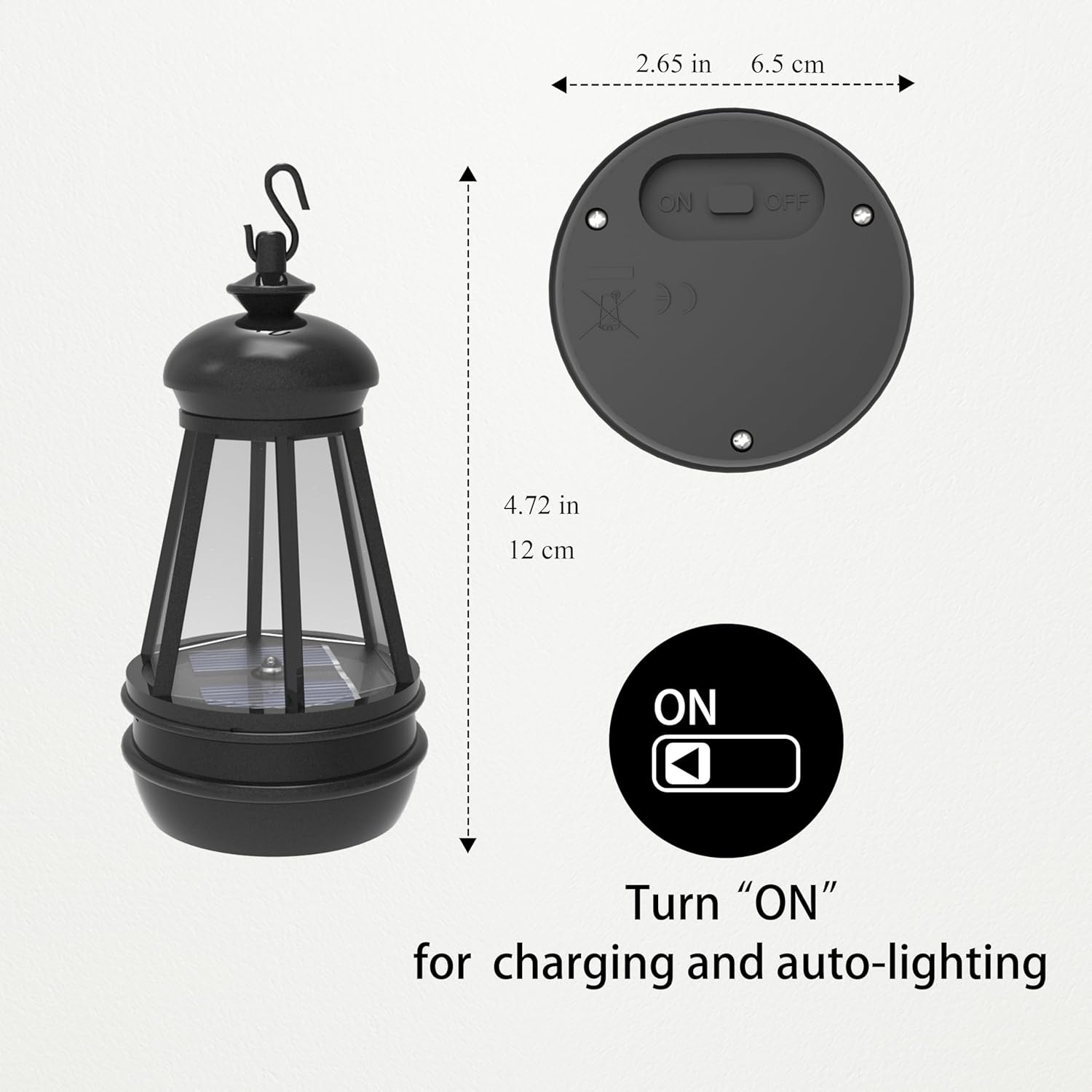 - Portable Size & Solar charging: 8.7"ร3.1"ร9.5". For the first use, turn the switch to โONโ, simply leave it charging in the sun (in case the energy runs out after a long period of time out of the sun during transportation), and it will automatically light up at dusk.