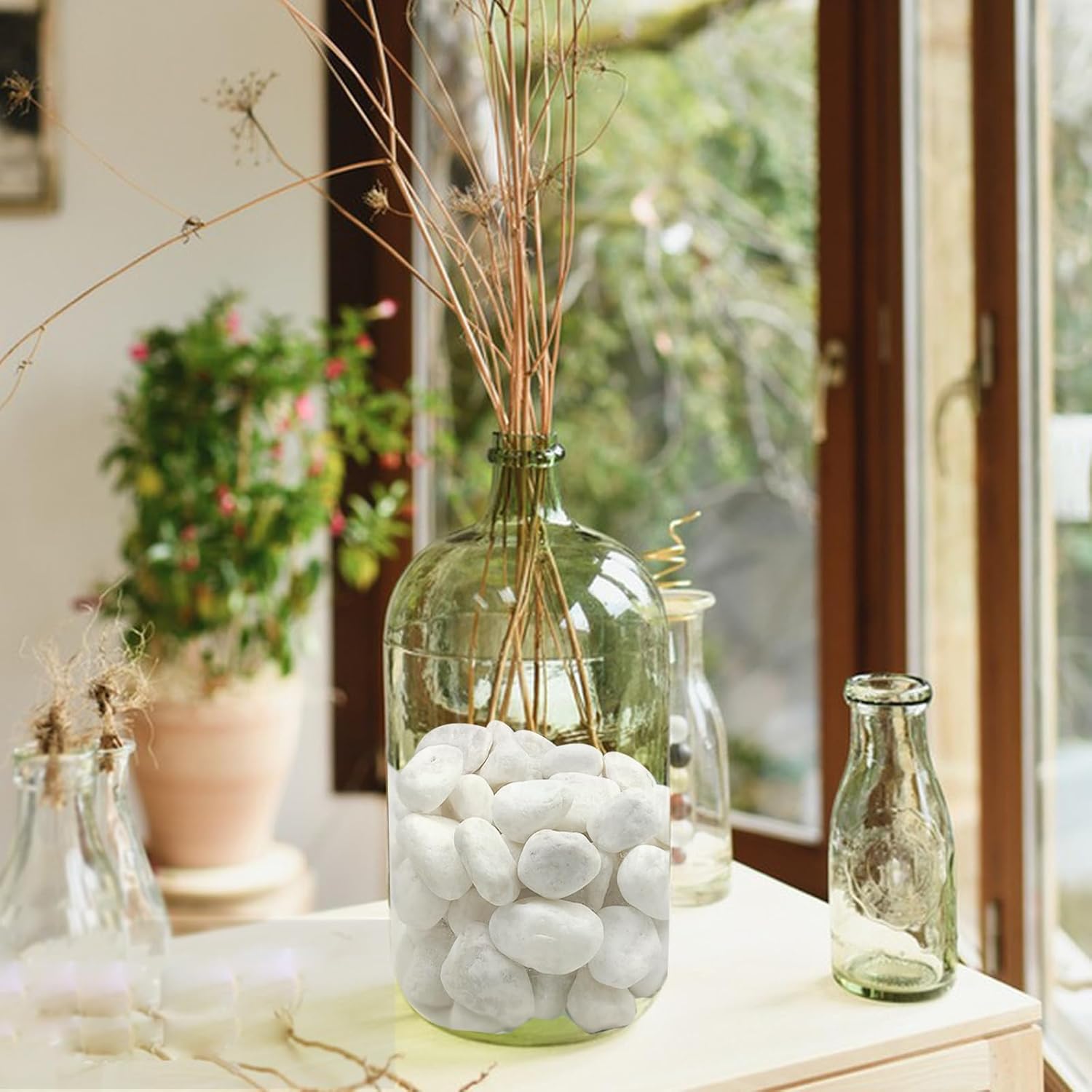 - 【Pebbles for Indoor Plants】White gravels are matte surface, natural colors, without sharp edges and corners, and will not hurt your succulents. They’re really bright, adding some white color to a plant terrarium. Ideal for cover the indoor potted plants, cactus, flower arrangements, vase fillers, water features and aquarium decorative