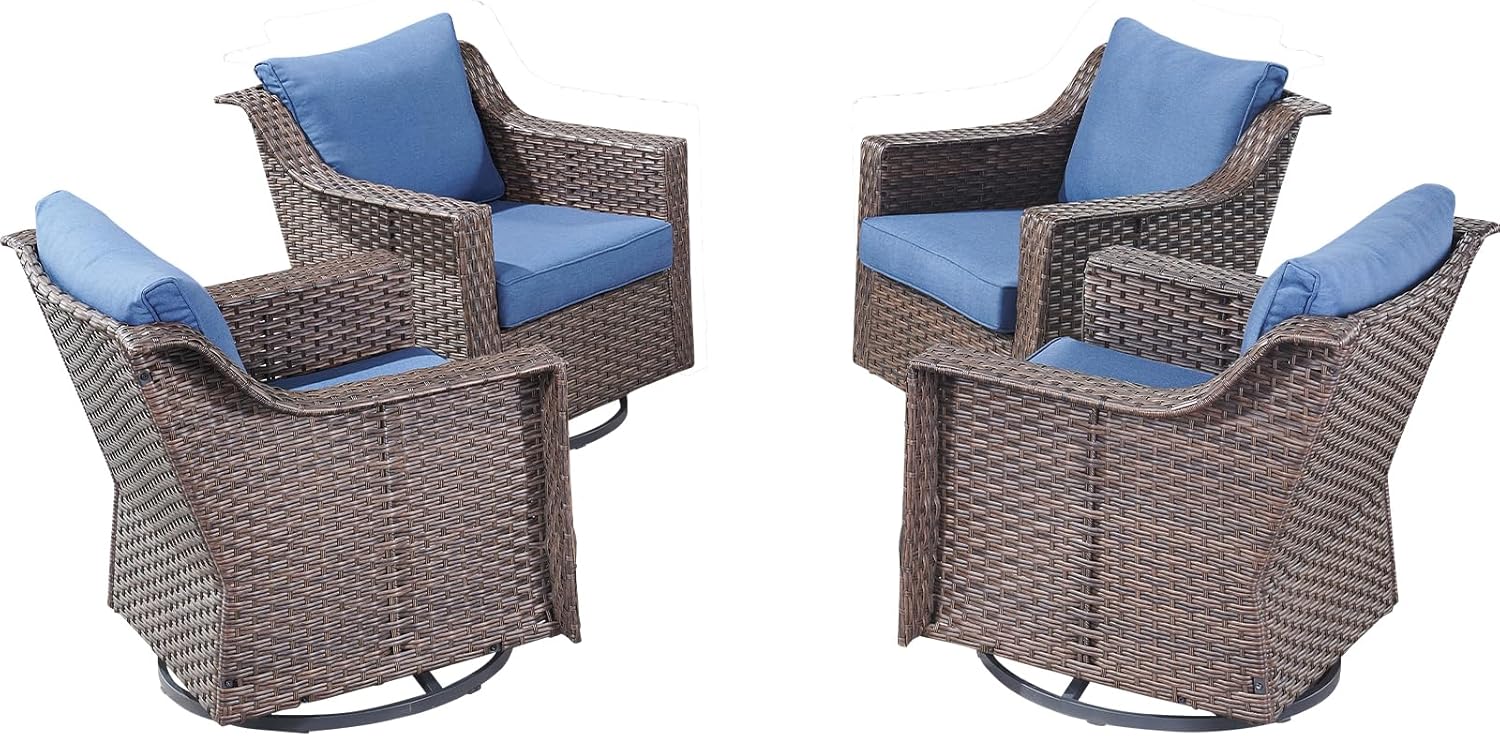 Outdoor Patio Wicker Swivel Chairs - Set of 4 Outside Rattan Rocker Glider Chair Rocking Armchairs for Front Porch Balcony Backyard Yard Deck Poolside Apartment – Brown/Blue