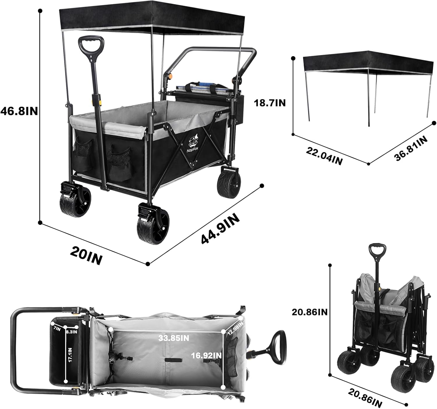 Collapsible Wagon Foldable Wagon Cart with Removable Canopy, Adjustable Push Pulling Handles,Cooler Bag Utility Carts for Shopping, Picnic, Camping,Black Grey