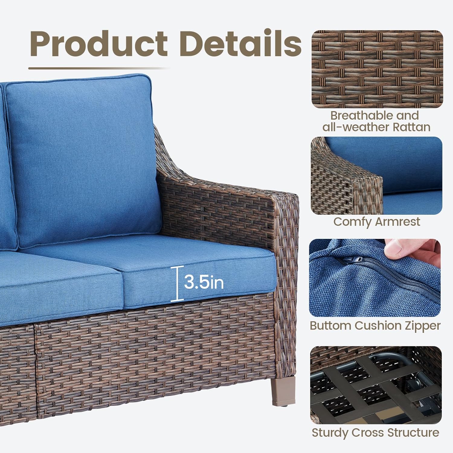 Outdoor Wicker Patio Furniture Set - 5 Piece Outside Rattan Conversation Bistro Sofa Sets with Wicker Chairs, 3-Seat Couch and Ottomans for Porch Balcony Yard Fireplace – Brown/Blue