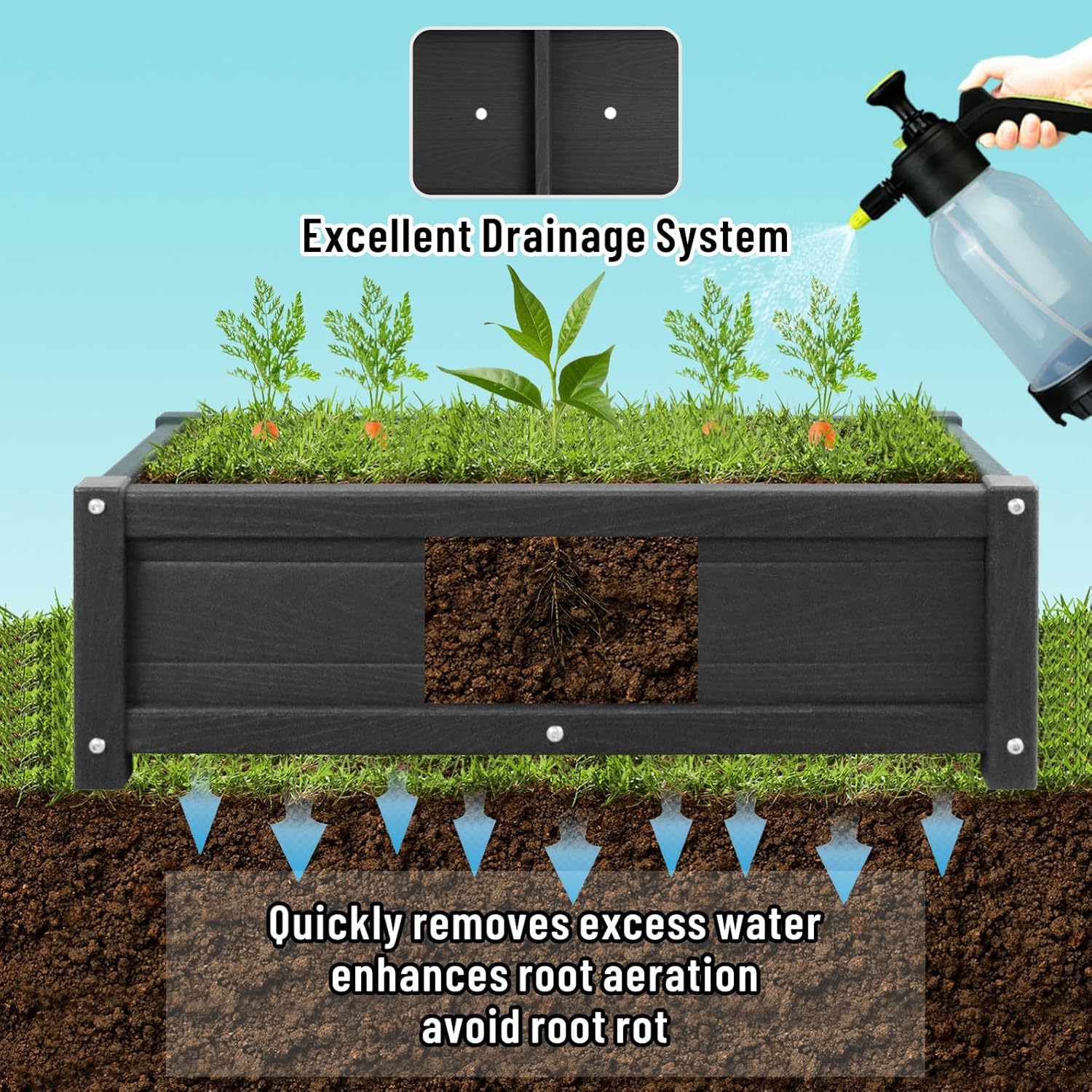 - Drainage Hole Design:Raised garden bed with bottom features an outstanding drainage system that helps prevent soil waterlogging, keeps the soil fresh, and protects plant roots from rotting