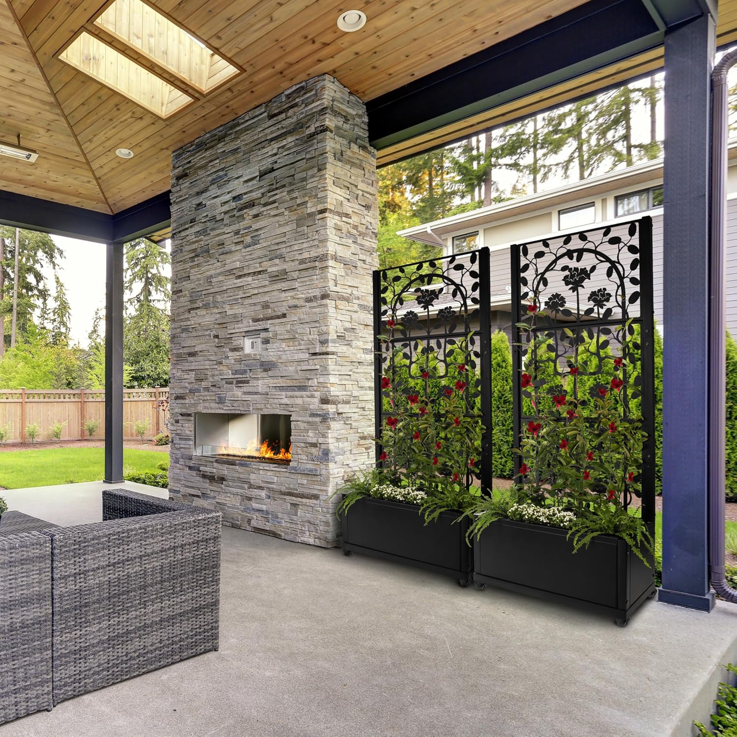 - Heavy and requires assembly - Trellis planter for indoor outdoor - This garden planter with trellis can be used with climbing plants on your deck, patio, or balcony. Use outdoors or indoors, this privacy screen with trellis has a black powder-coated finish, blends with any decor. This flower box with trellis features precision, laser cut, 16-gauge steel and can be used in residential or commercial venues.