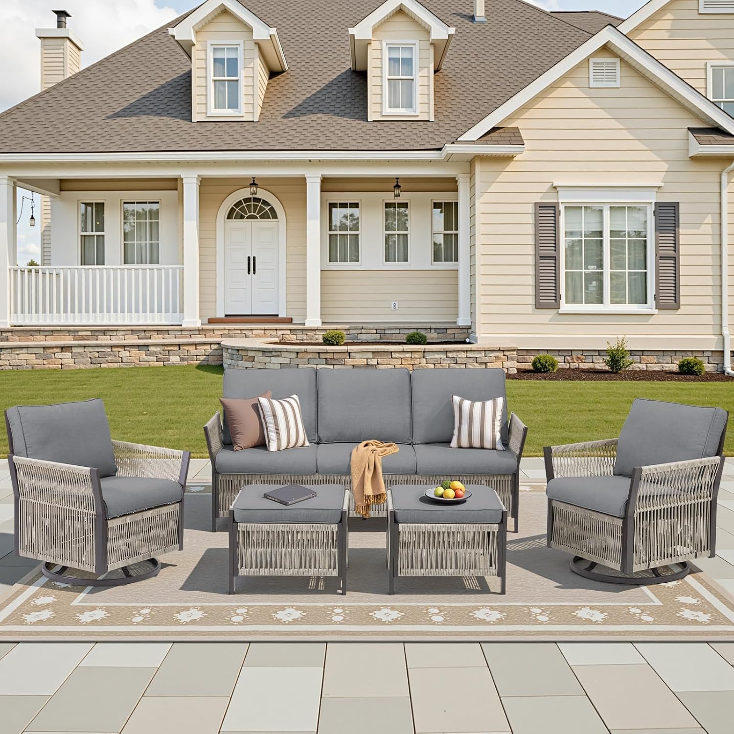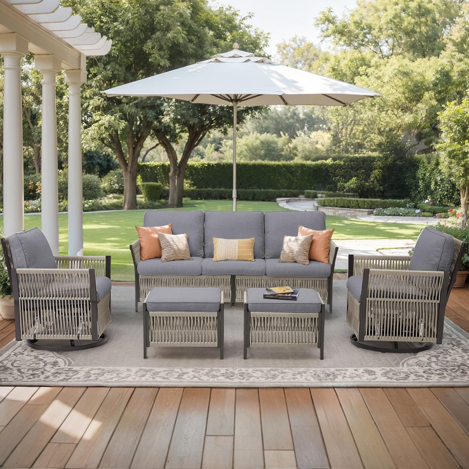 - Modern Minimalist Design: This modern outdoor furniture set stands out with its minimalist design, combining faux rope rattan and exposed metal tubing for a sleek look. Unlike the bulky full-width rattan designs, this set offers a lighter, more refined aesthetic. The contrast between the exposed tubing and the rattan color adds a contemporary touch to any outdoor patio furniture set