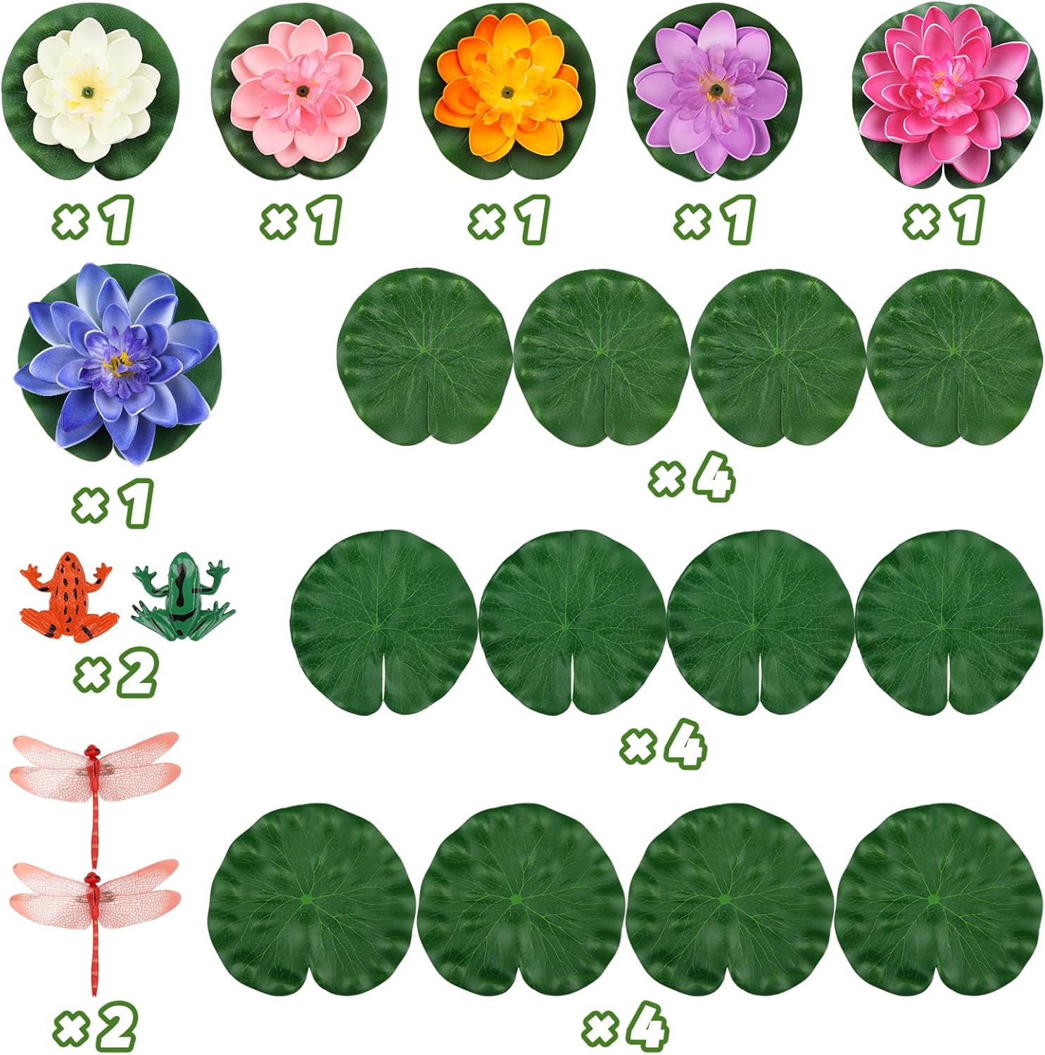 22 Pack Artificial Floating Foam Lotus Flowers with Artificial Frog Lotus Leaves, Lily Pads for Lake, Pond Plants Ornaments for Pool Water Decoration, Colorful