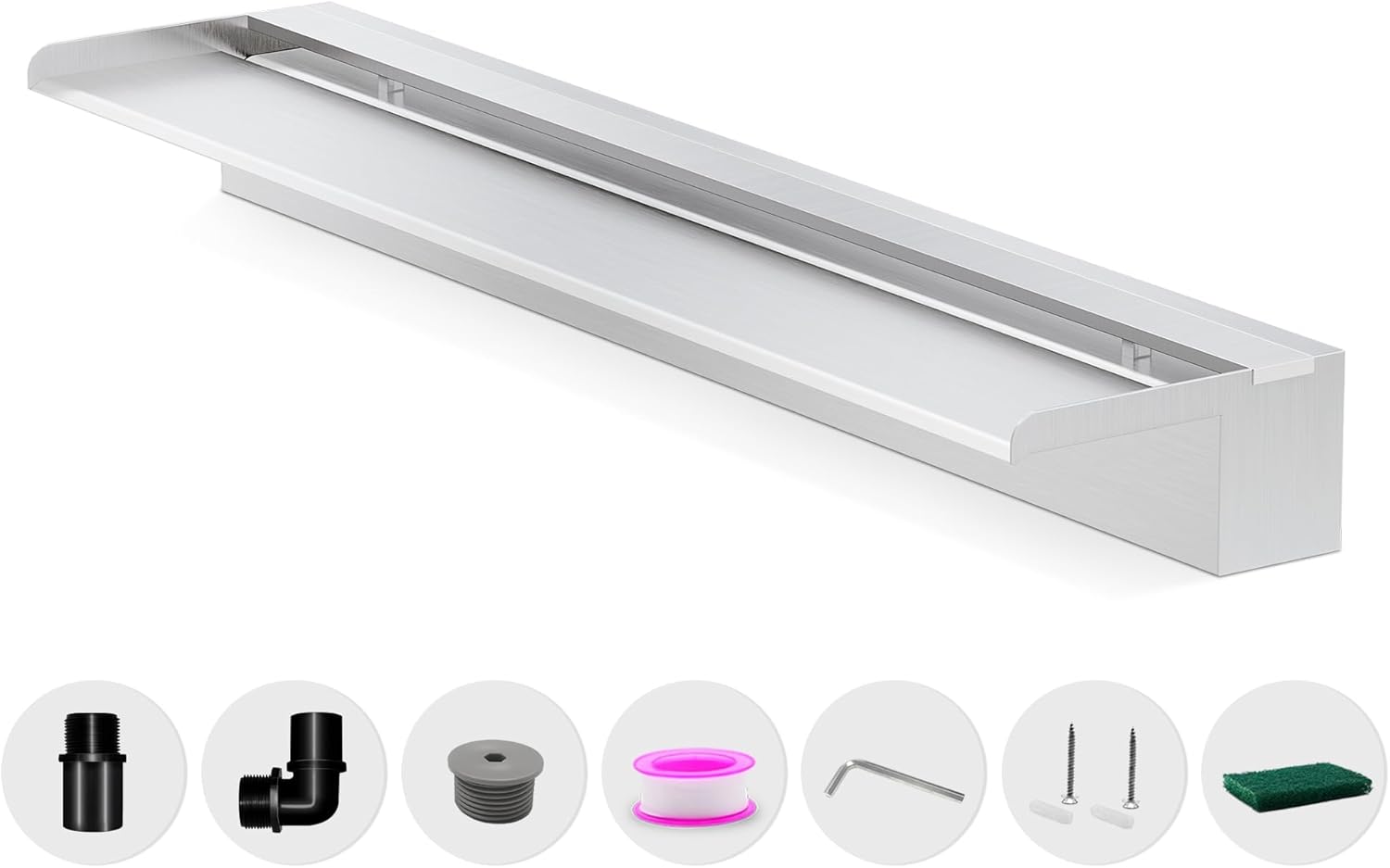 - ăAnti-Rust Spillway Waterfallă- The main body of this stainless steel spillway waterfall is welded together using 304 stainless steel for stable long-term use, featuring an top open lip design that creates elegant, invigorating, freefalling water effects to add a decorative touch to ponds and pools, letting you enjoy the relaxing sounds of water for a sense of calm and well-being. LED light strips not included, but available separately.