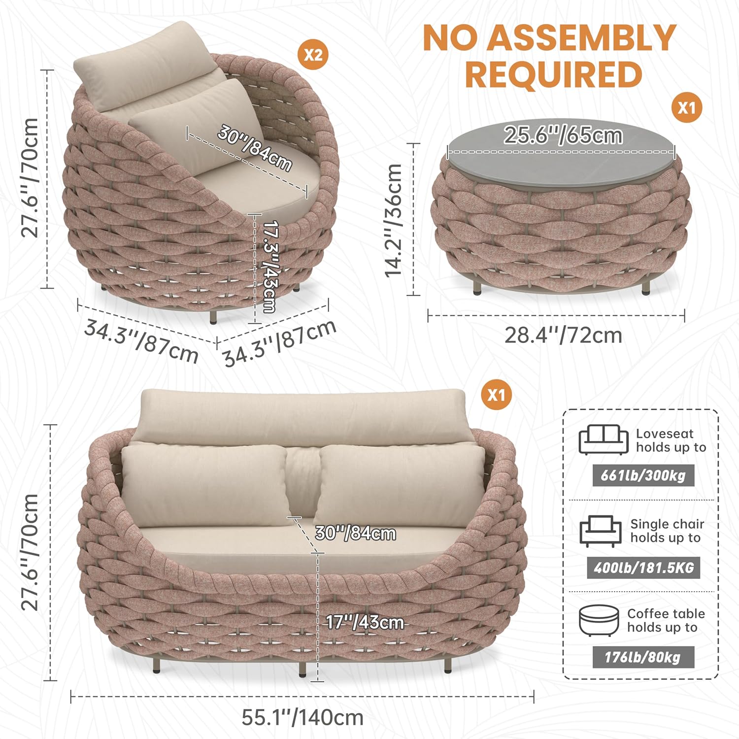 - Patio set includes: 2 sofa armchairs, 1 love seat, and 1 coffee Table. Size: Single sofa: 34.3''(L)X34.3''(W)X27.6''(H) holds up to 400 lbs/181.5kg; Loveseat: 55.2''(L)X34.7''(W)X27.6''(H) holds up to 660 lbs/300kg; Side table: 28.4''(L)X28.4''(W)X14.2''(H) holds up to 176 lbs/80kg. Color: Terracotta rope with beige fabric