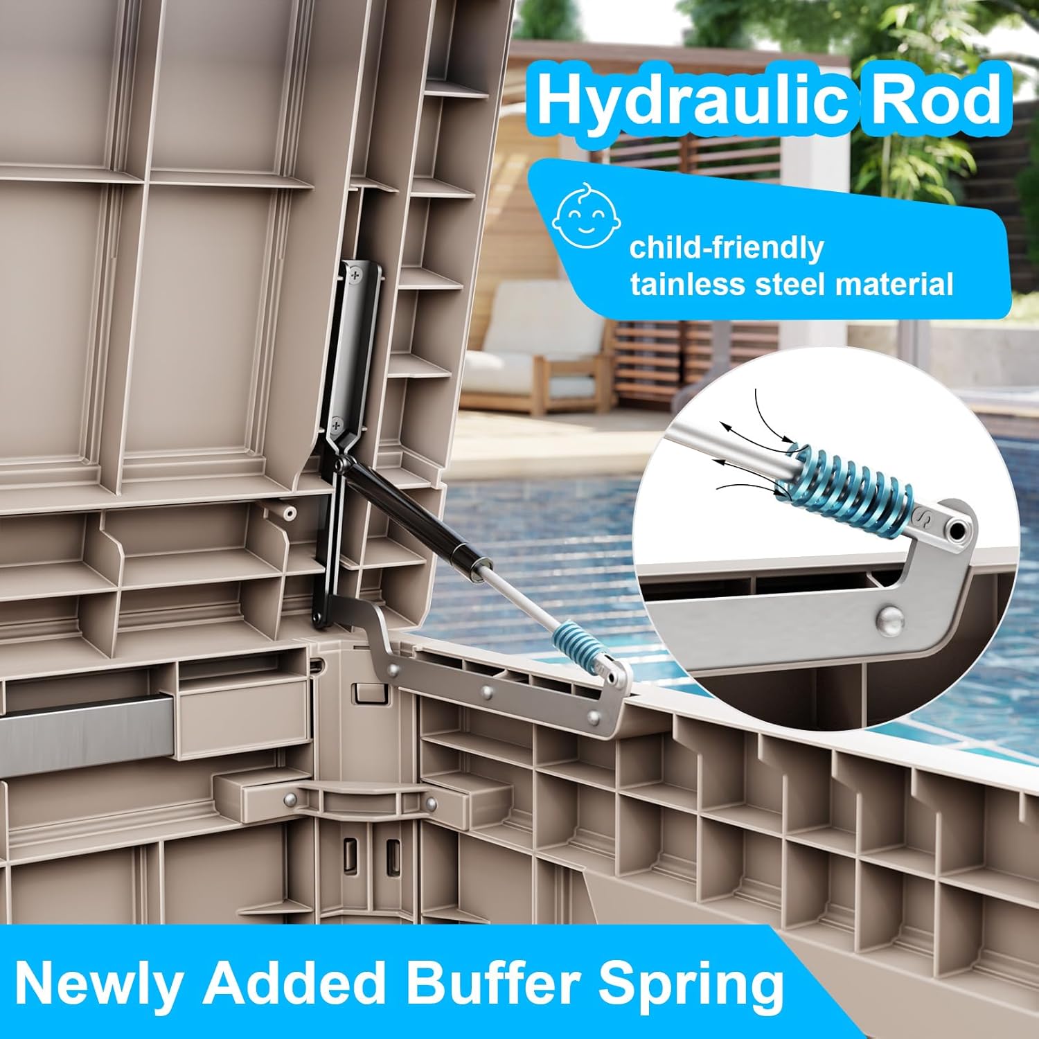 - Safety design: Each deck box has lockable holes (not included) for added security; in addition, the box is equipped with a hydraulic stand, which allows easy opening and slow closing and prevents hand pinching. The outdoor waterproof deck box has built-in handles on both sides, ensuring easy grabbing and moving