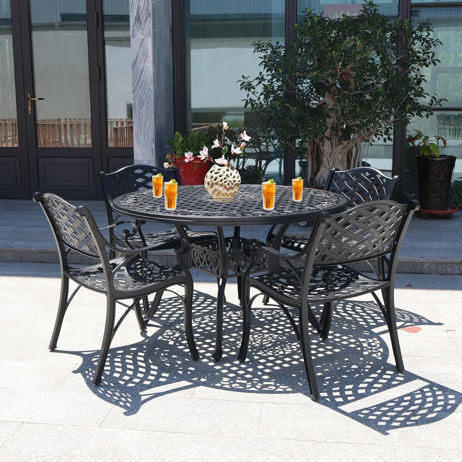 5 Pieces Cast Aluminium Patio Dining Set for 4-6 Person,Round 48" Patio Table and Chairs Set of 4 with 2.3" Umbrella Hole,Outdoor Patio Furniture Dining Set for Porch Backyard Deck, Black