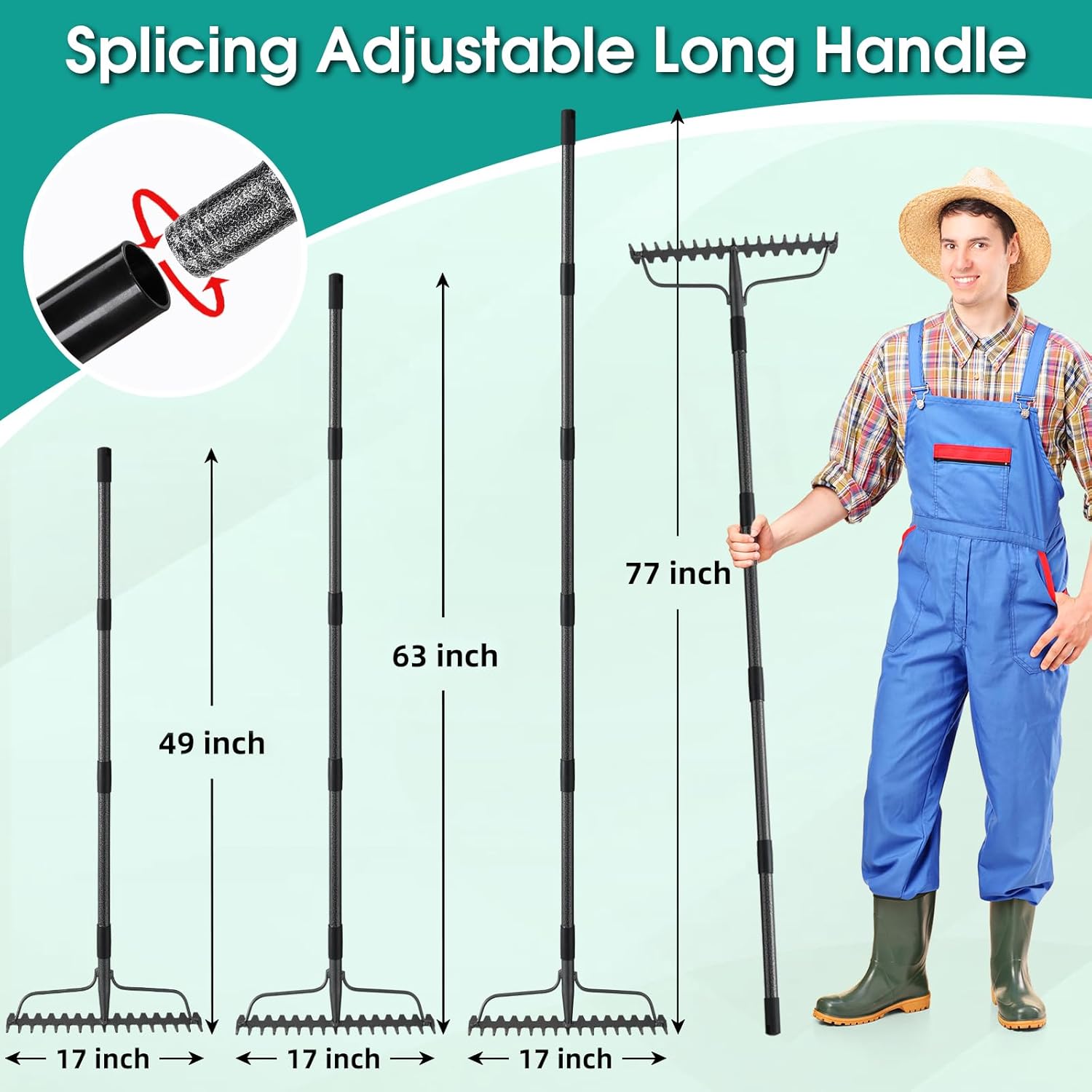- 63" Long Splicing Handle: Featuring a multi-section splicing handle, this rake allows for customized length adjustment, perfect for users of all heights. The extended reach helps reduce bending and back strain, ensuring comfortable use for long hours in the garden