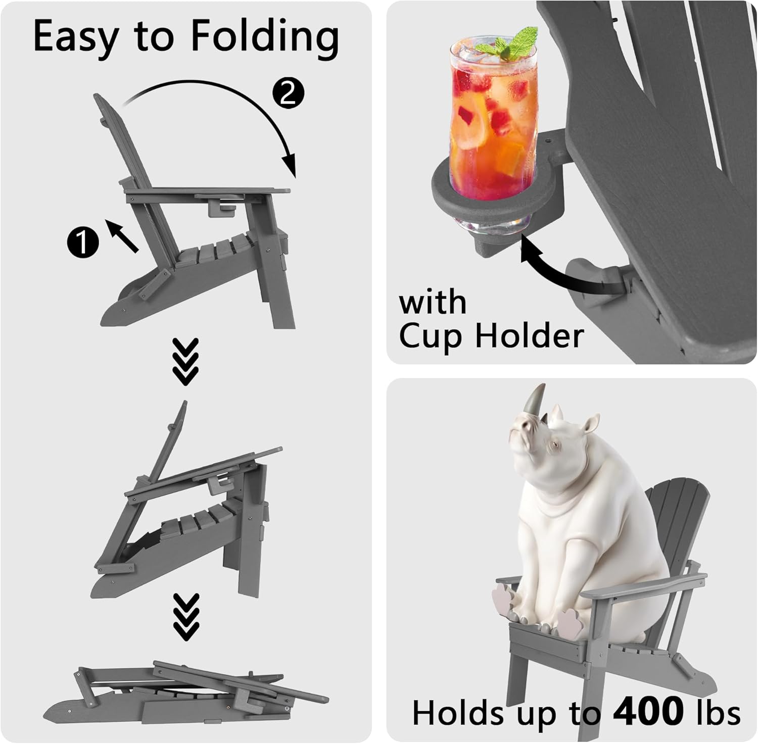 Folding Adirondack Chair - Extended Ergonomic Backrest, Cup Holder - Easy Assembly - Durable HDPE Plastic, Weather Resistant & Maintenance-Free - Lawn, Patio, Deck Supports 400lbs Grey