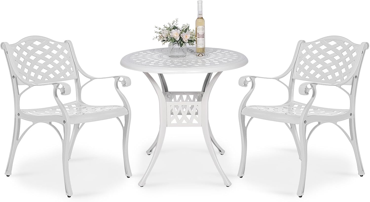 VIVIJASON 3-Piece Patio Furniture Dining Set, All-Weather Cast Aluminum Outdoor Bistro Set, Include 2 Dining Chairs and 31" Round Table w/ 2" Umbrella Hole for Balcony, Lawn, Garden, Backyard, White