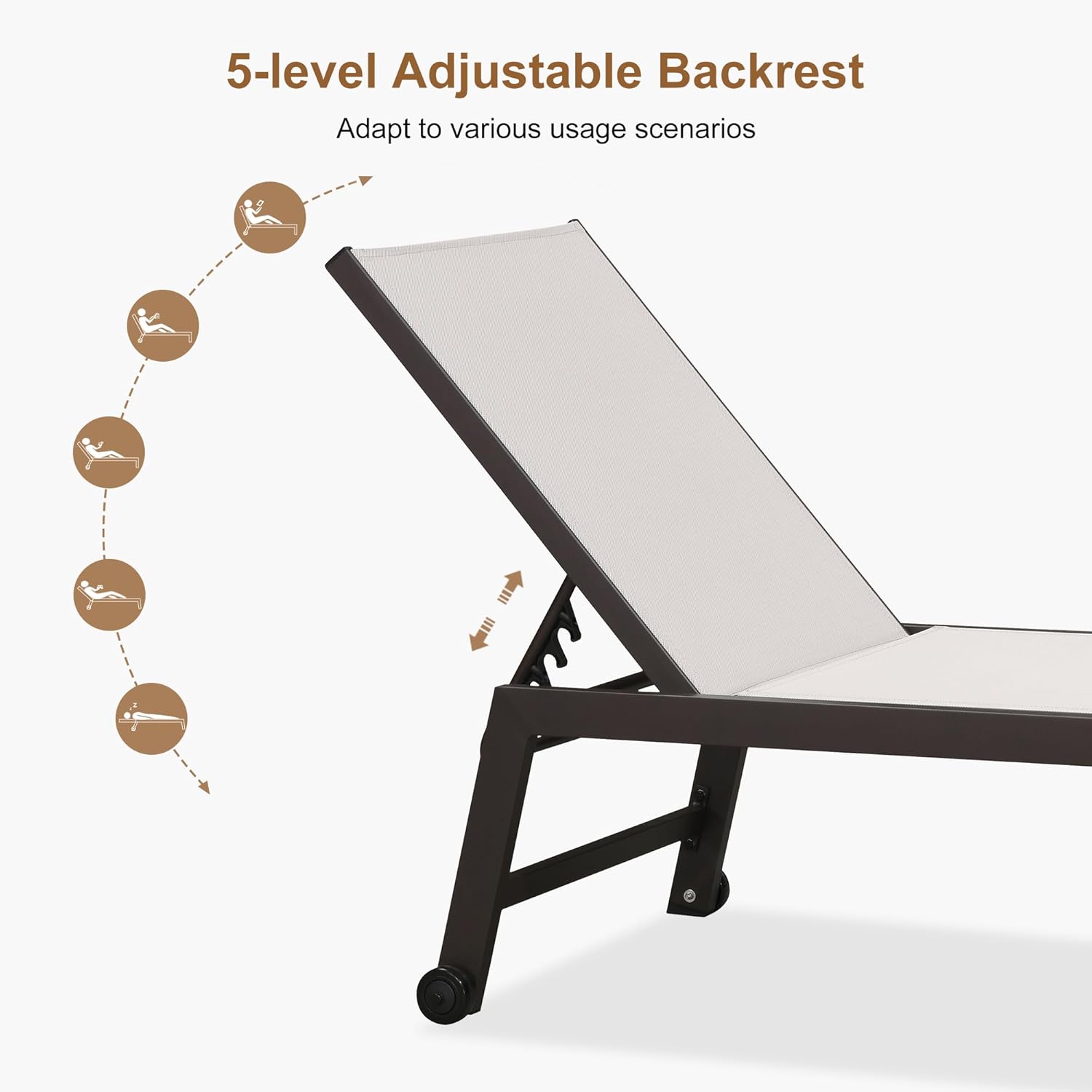 - STURDY FRAME: Rugged powder-coated aluminum frame, the outdoor chaise lounge is rust-proof and durable. Besides, the backrest has a triangular structure that can hold up to 330 pounds, providing you with reliable support.