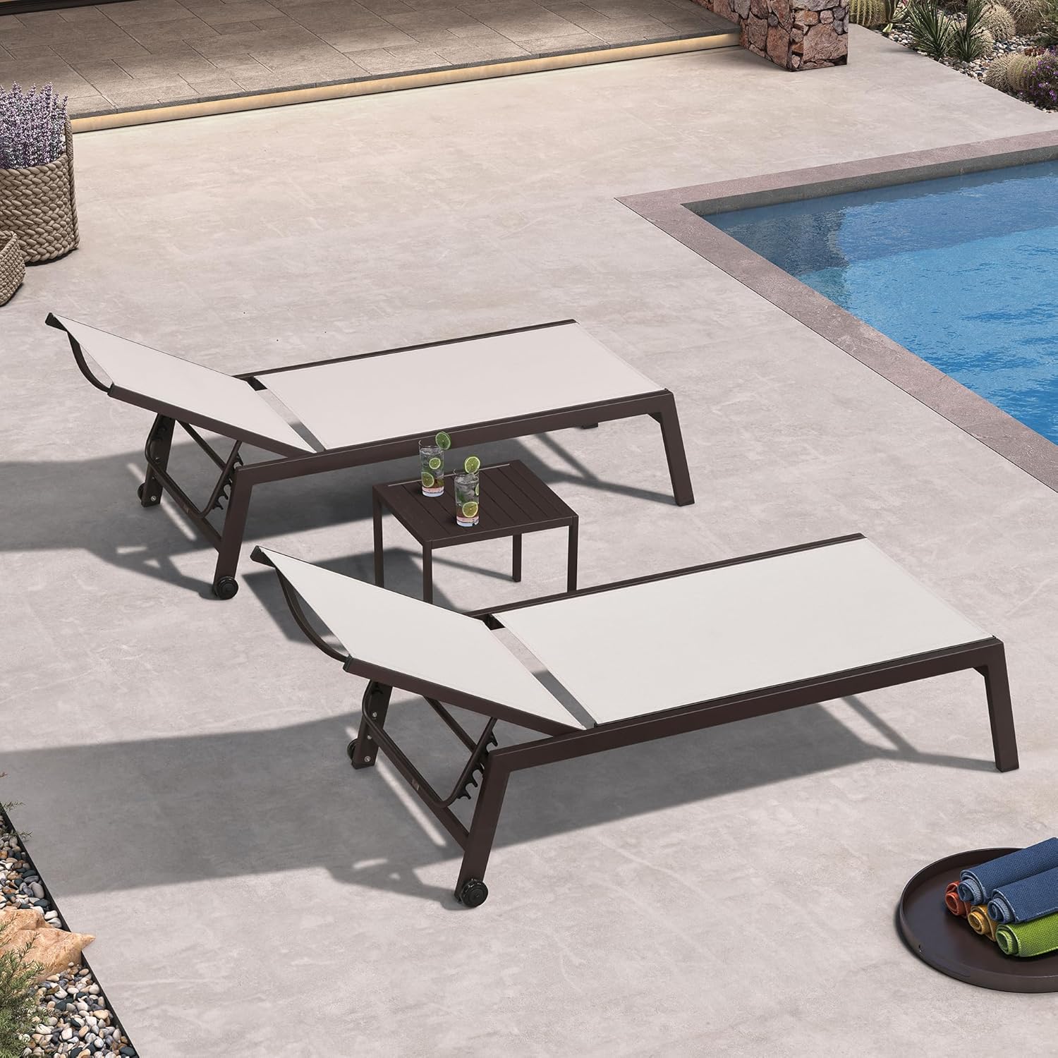 PURPLE LEAF Oversized Patio Lounge Chairs Set of 3, Reclining Pool Lounge Chairs with Side Table and Wheels for All Weather for Outdoor, Deck, Lawn, Aluminum Outside Pool, Linen
