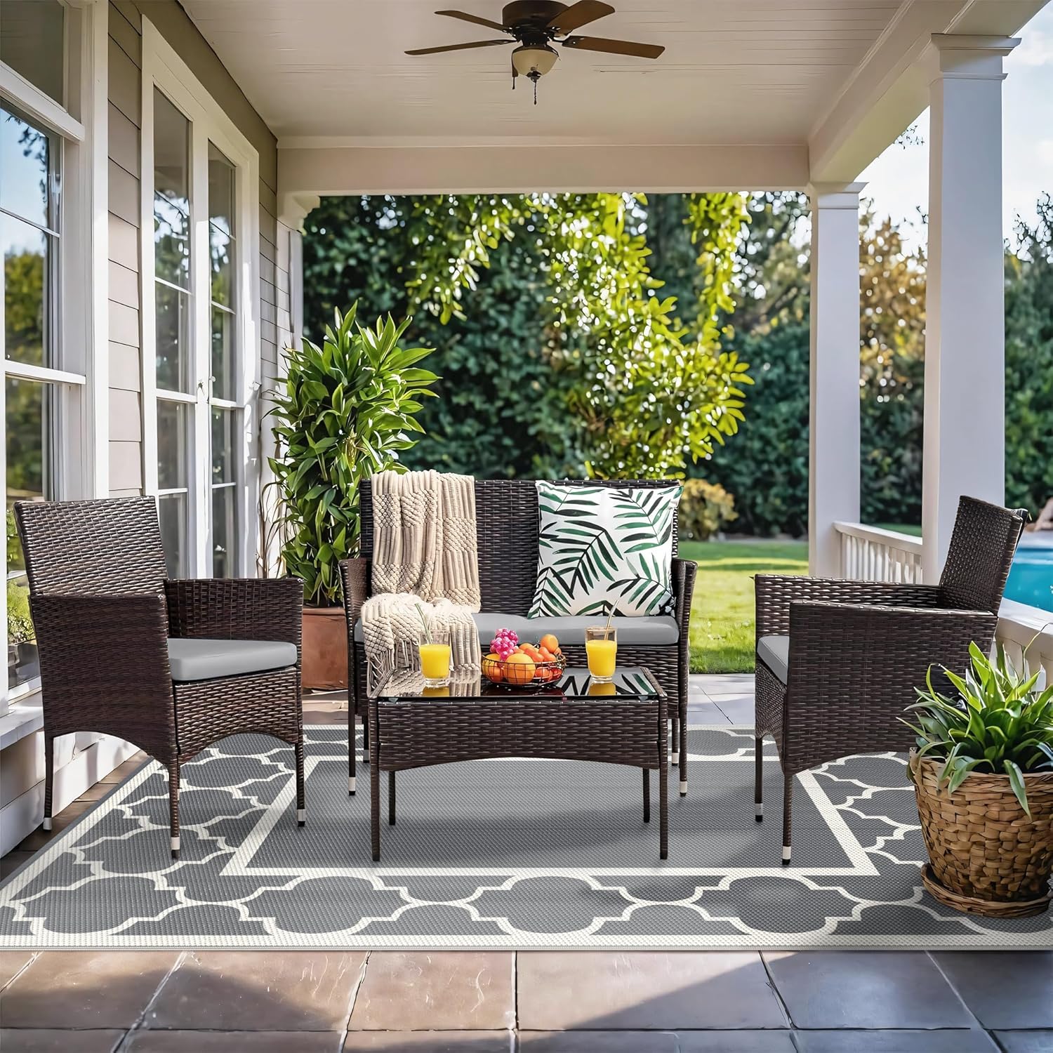 - Mood-Boosting Colors:Choose stain-resistant dark tones or go modern with blue & white or black. The reversible mat, with outdoor carpet qualities, is easy to clean and coordinates seamlessly with various decors. Whether placed on your deck or under a shaded umbrella, it serves as the perfect outdoor patio rug to match the style of your pamapic outdoor furniture.It’s an excellent piece for fall home decor or to use as a stylish outdoor rug fall accent