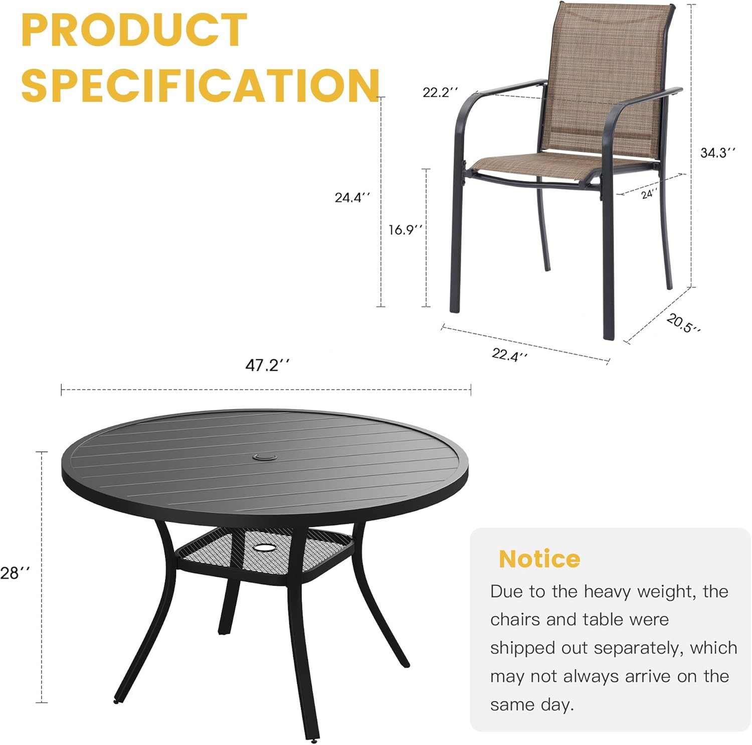 VICLLAX Patio Dining Set for 6, Outdoor Furniture Set Includes 47.2" Round Patio Table and 6 Patio Sling Chairs, Black Tabletop and Brown Fabric