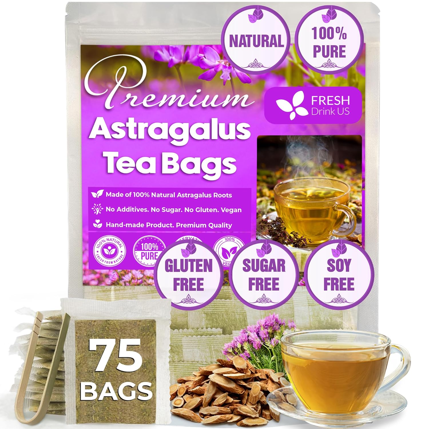 FreshDrinkUS, Premium 75 Astragalus Root Tea Bags, 100% Natural & Pure from Astragalus Root. Astragalus Root Herbal Tea. Made with Natural Material Tea Bags. No Sugar, No Caffeine, No Gluten, Vegan.