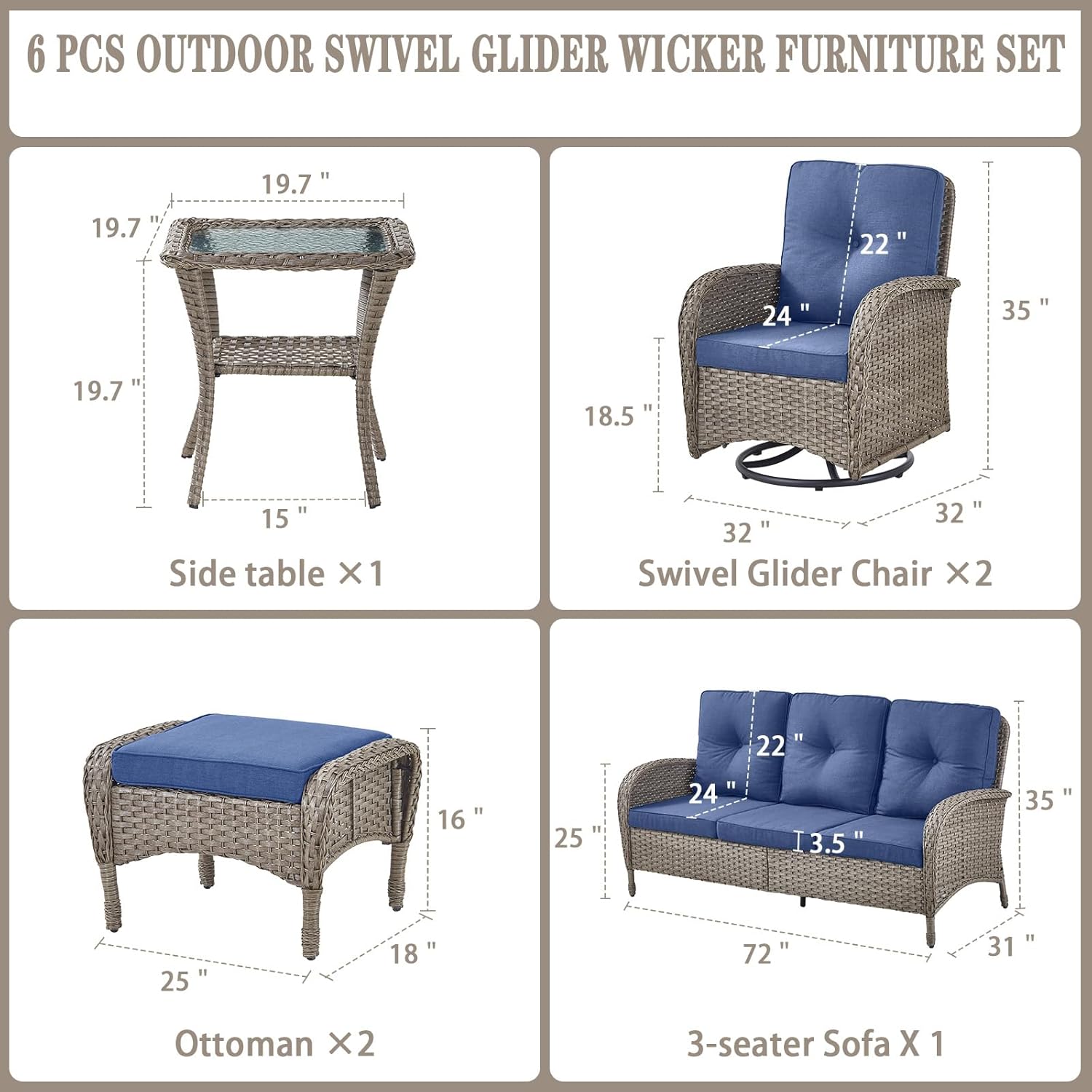 - 1.PATIO CONVERSATION SETS DETAILS: The 6 pcs patio furniture set includes 2 wicker swivel rocker chairs, 1 outdoor couch, 2 ottomans and 1 glass top side table, each chair has a weight capacity of 300 pounds and the side table has a weight capacity of 50 pounds. The brown color wicker with blue cushions in a simple and premium tone is perfect for decorating your patio, porch, balcony, sunroom and other outdoor spaces.
