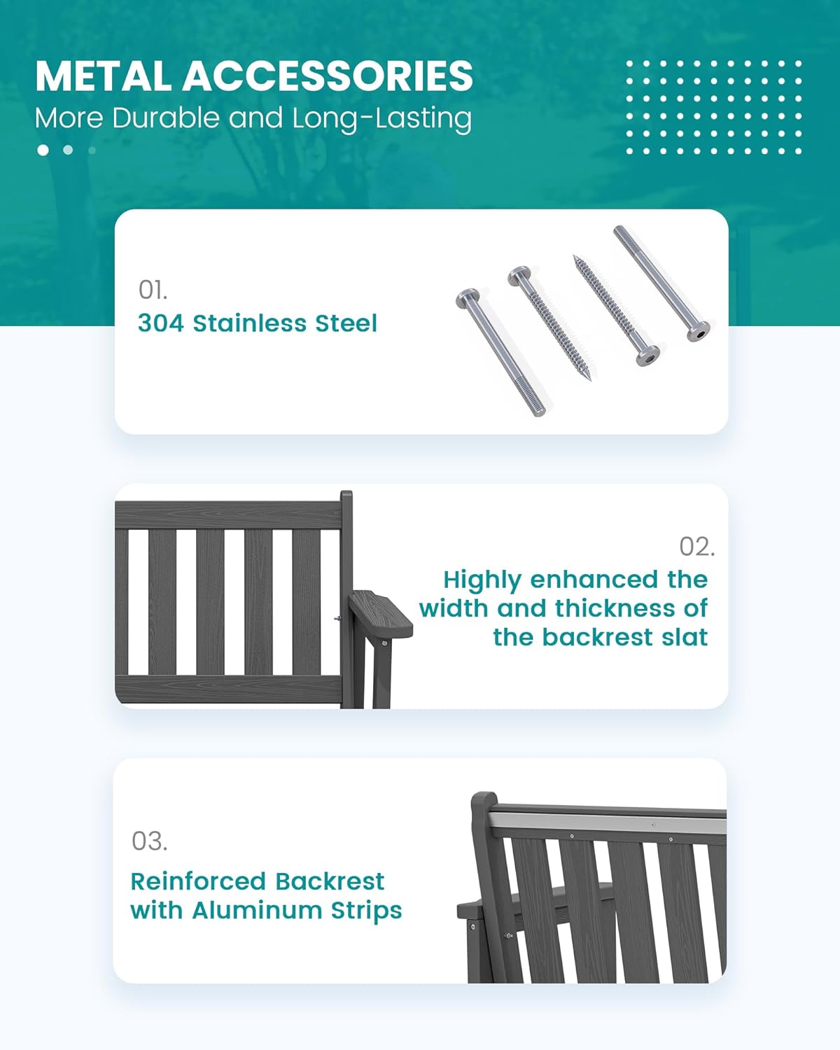 - Reinforced Aluminum Bar: SERWALL garden benches for outdoors are built to last, with sturdy aluminum strips reinforcing the backrest for added durability without compromising comfort. The reinforced chair is more durable and resistant to deformation, ensuring long-term outdoor use.